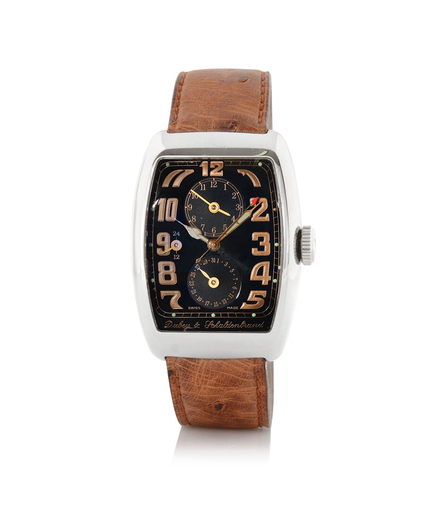 C. tonneau-shaped, stainless steel with case back secured by screws. D. glossy and matt black with painted Arabic numerals, luminous indexes and hands, centre seconds, subsidiary dial for date at 6, 24 hours at 9 and subsidiary dial for second time zone with two hands at 12. M. self-winding. Dial, case and movement signed. Accompanied by Dubey & Schaldenbrand stainless steel buckle.