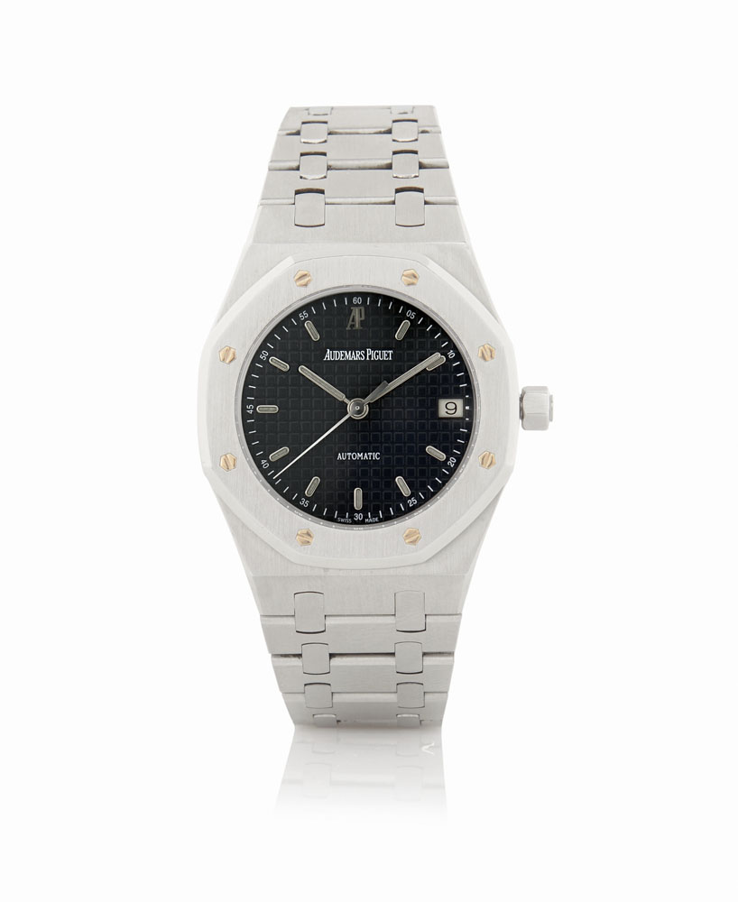 C. stainless steel, case back and octagonal bezel secured by screws. D. blue Grande Tapisserie with luminous indexes and hands, centre seconds and date at 3. M. self-winding. Stainless steel bracelet. Dial, case, movement and bracelet signed.