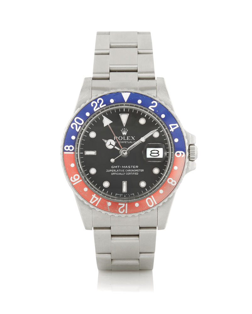 C. stainless steel, screwed case back and crown, red-blue graduated revolving bezel. D. black with luminous indexes and hands, centre seconds, central hand for second time zone, date at 3. M. self-winding. Stainless steel Oyster bracelet. Dial, case, movement and bracelet signed.
