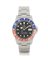 Cassa n. 8246101 in acciaio con fondello e corona a vite, lunetta rosso-blu girevole con 24 ore. Quadrante nero con indici e lancette luminescenti, secondi e lancetta per fuso orario al centro, data al 3. Movimento a carica automatica. Bracciale Oyster in acciaio. Quadrante, cassa, movimento e bracciale firmati.