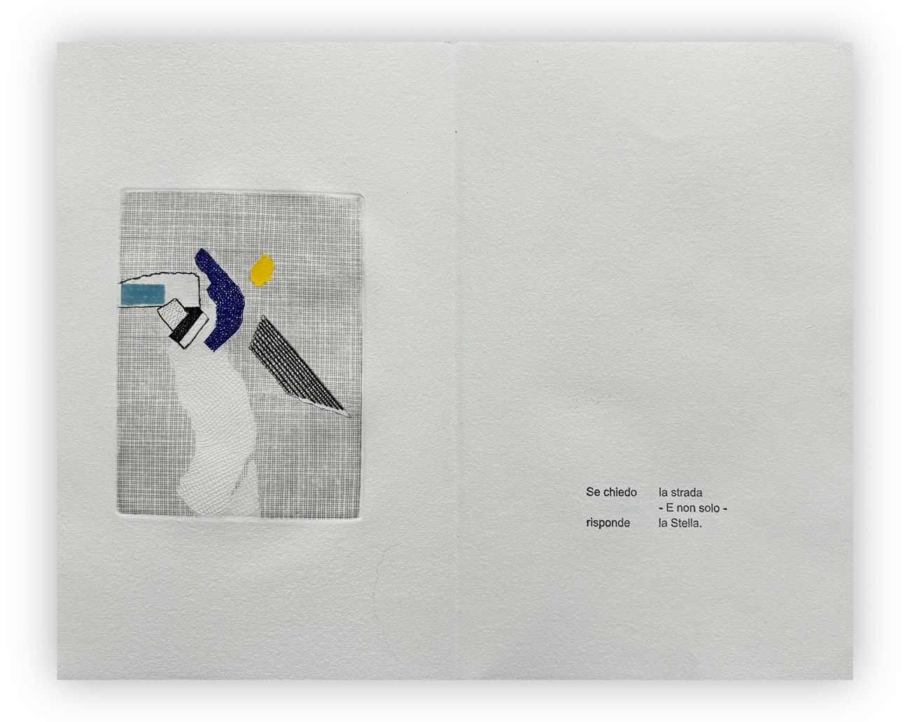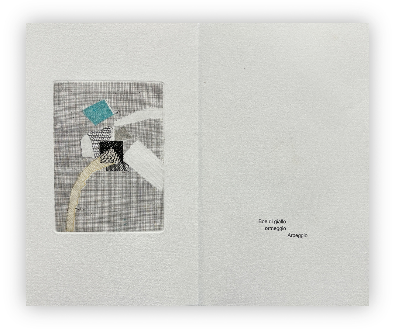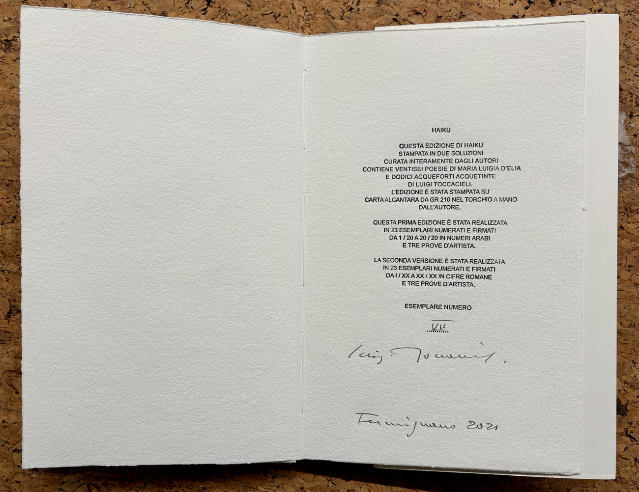Edizione d'arte, realizzata su carta Alcantara 210 gr, recante 26 poesie di Maria Luigia D'Elia illustrate da 12 acqueforti acquetinte di Luigi Toccacieli