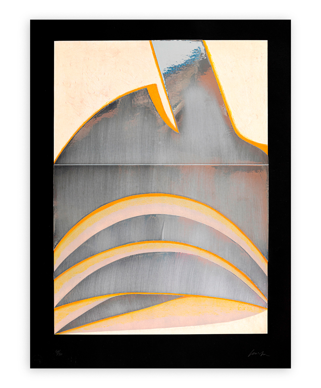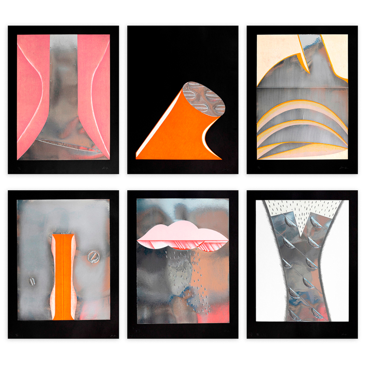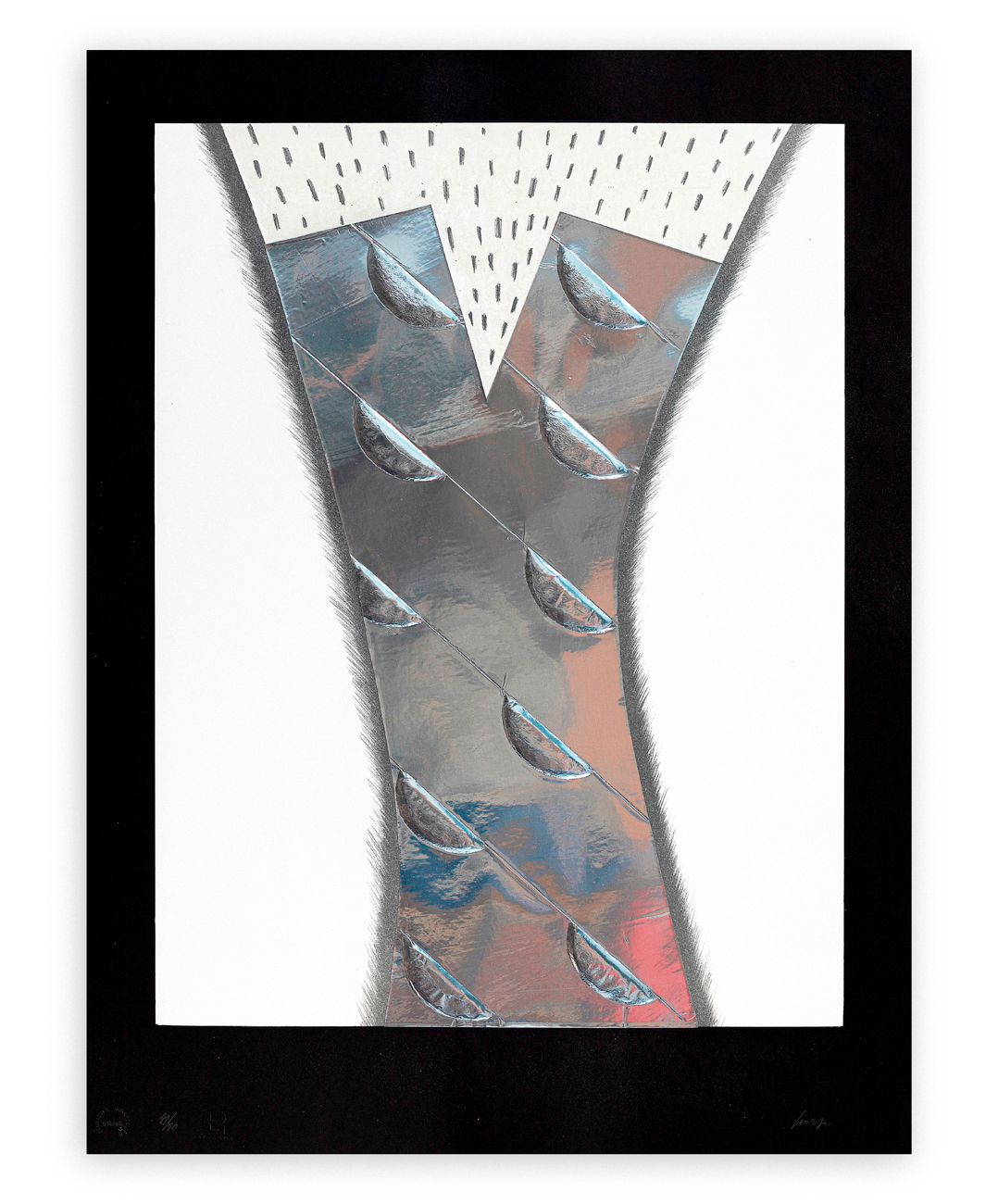 Cartella contenente 6 incisioni originali con elementi in alluminio di Gino Scarpa, ciascuna recante firma e numerazione (Esemplari 57/90) a matita al fronte e timbri a secco dello Stampatore e dell'Editore