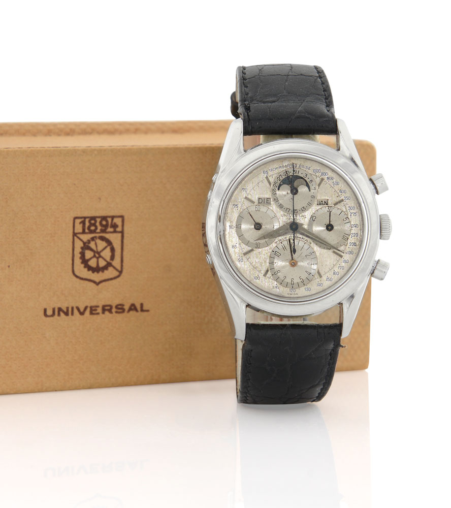 C. stainless steel with screwed case back and round buttons. D. silvered, brushed with applied indexes, 30 minute and 12 hour registers, aperture for day and month, outermost date with corresponding hand, phases of the moos at 12. M. manual winding. Dial, case and movement signed. Accompanied by Universal box.