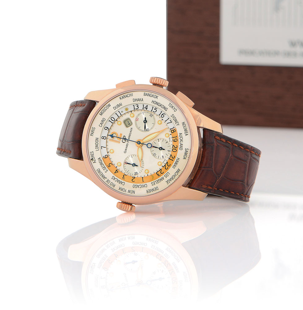 C. 18K pink gold, transparent case back secured by screws, eliptical-shaped buttons, second crown at 9 to rotate the city disc, sapphire crystals. D. silvered with applied Arabic numeral, luminous indexes and hands, 30 minute and 12 hours registers, date between 1 and 2, outer revolving ring for 24 hours with night/day division, outermost revolving disc bearing names of world locations. M. self-winding. Dial, case and movement signed. Accompanied by Girard Perregaux strap, 18K pink gold deployant clasp, box and certificate dated 11/2009.