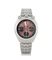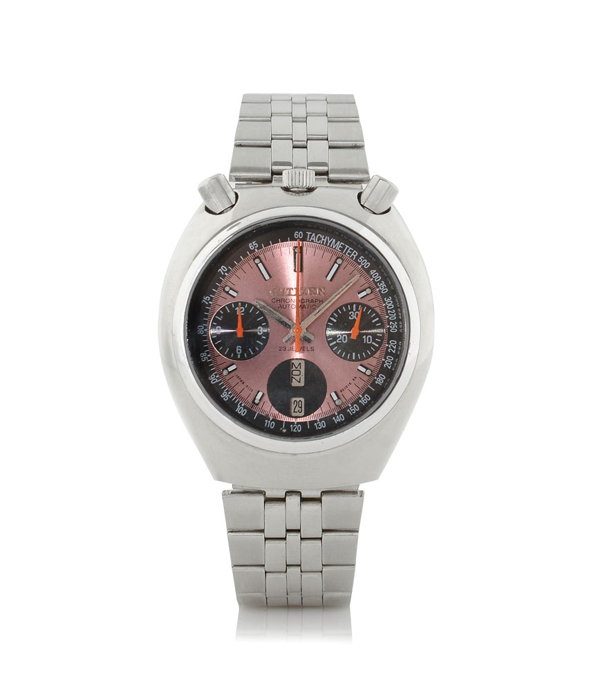 Cassa tonneau in acciaio con fondello a vite e pulsanti tondi all' 1 e 11, vetro zaffiro. Quadrante bicolore rosa e nero con indici applicati, contatore a 30 minuti e 12 ore, finestrella per giorno e data al 6, scala tachimetrica periferica. Movimento a carica automatica. Bracciale in acciaio. Quadrante, cassa, movimento e bracciale firmati.