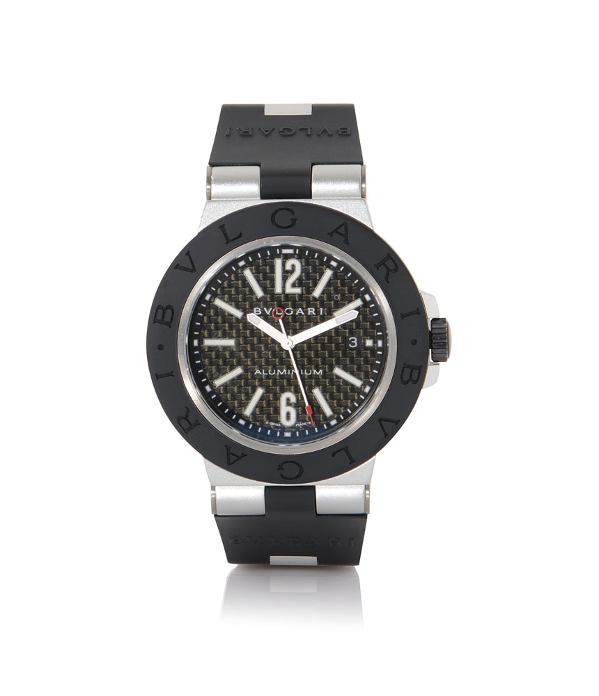 C. aluminum with black rubber bezel and sapphire crystal. D. carbon fiber with luminous indexes, Arabic numerals and hands, date at 3. M. self-winding. Rubber and aluminum strap. Dial, case, movement and bracelet signed. Accopanied by Bulgari aluminum buckle, box and certificate dated 01/2009.