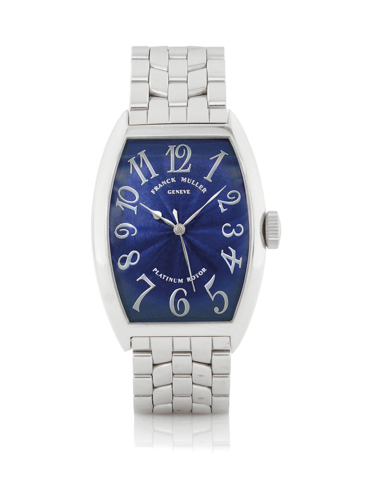 C. tonneau-shpaed, stainless steel with case back secured by screws, curved sapphire crystal. D. blue with applied Arabic numerals and centre seconds. M. self- winding. Stainless steel bracelet. Dial, case and movement signed. Accompanied by Franck Muller box and certificate.