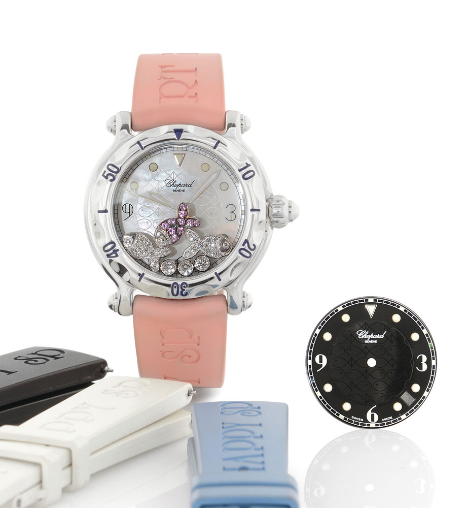 C. stainless steel with case back secured by screws, graduated revolving bezel, 3 diamonds and 3 fishes with diamond and pink stones floating between crystals. D. mother-of pearl with luminous indexes and hands, centre seconds and date between 4 and 5. M. quartz. Dial, case and movement signed. Accompanied by Chopard additional black dial, four rubber strap, pink, white, blue and black, stainless steel buckle.
