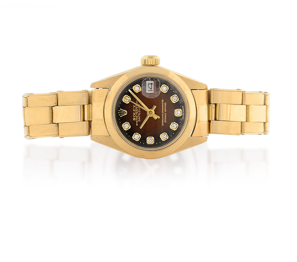 C. 18K yellow gold, screwed case back and crown. D. lacquered in the shades of brown with diamond indexes, centre seconds and date at 3 . M. self-winding. 18K yellow gold Oyster bracelet . Dial, case, movement and bracelet signed. Accompanied by Rolex box and original certificate.