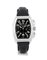 C. tonneau-shaped, stainless steel with case back secured by screws, screwed crown and teardrop buttons. D. black with luminous Arabic numerals and hands, 30 minute and 12 hour registers, date at 6. M. self-winding. Dial, case and movement signed. Stainless steel Franck Muller buckle and box.