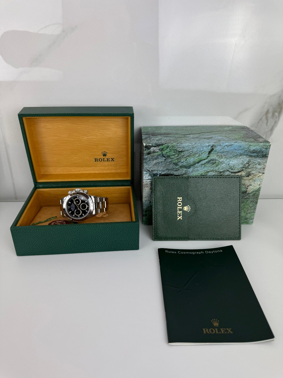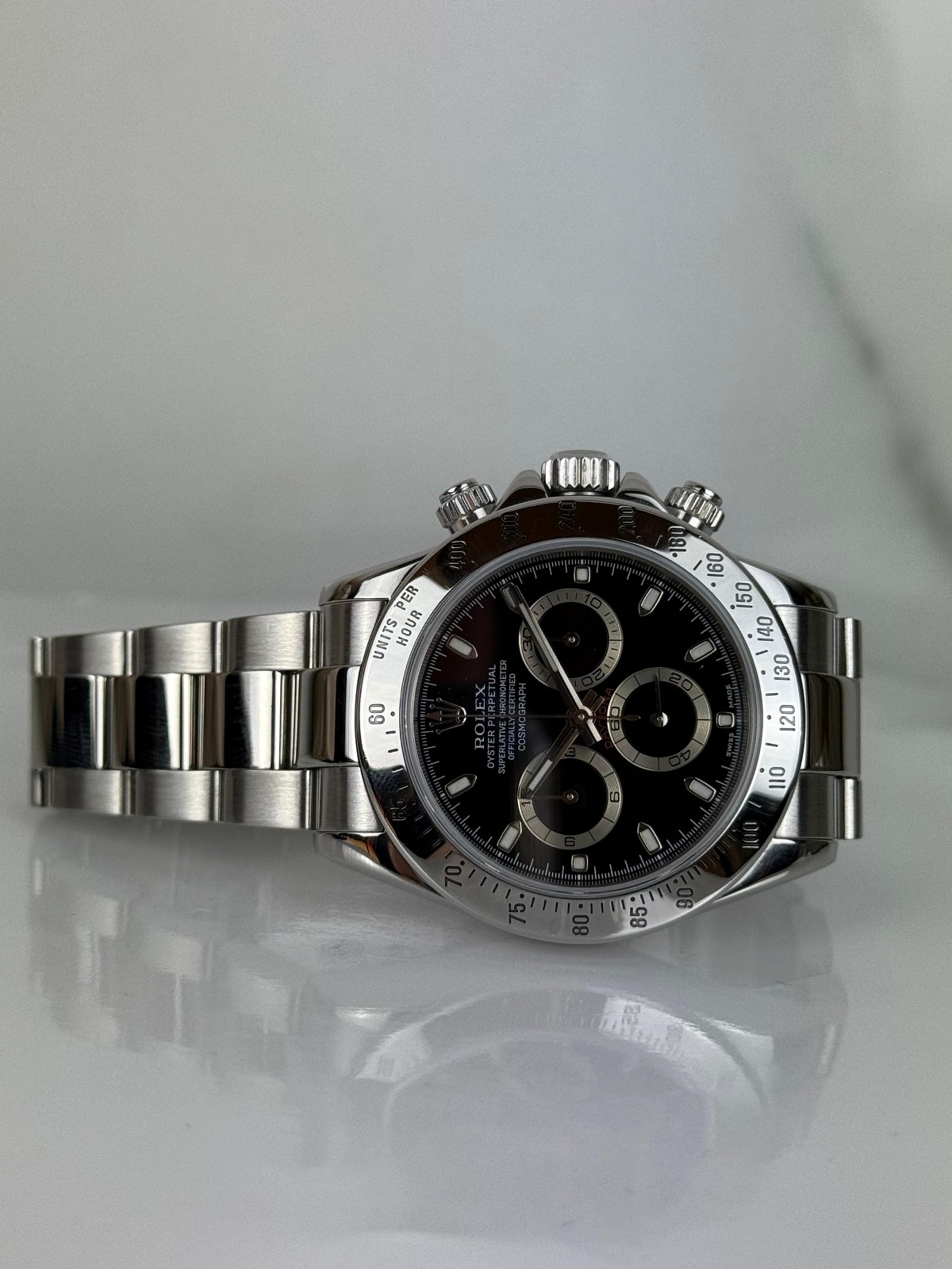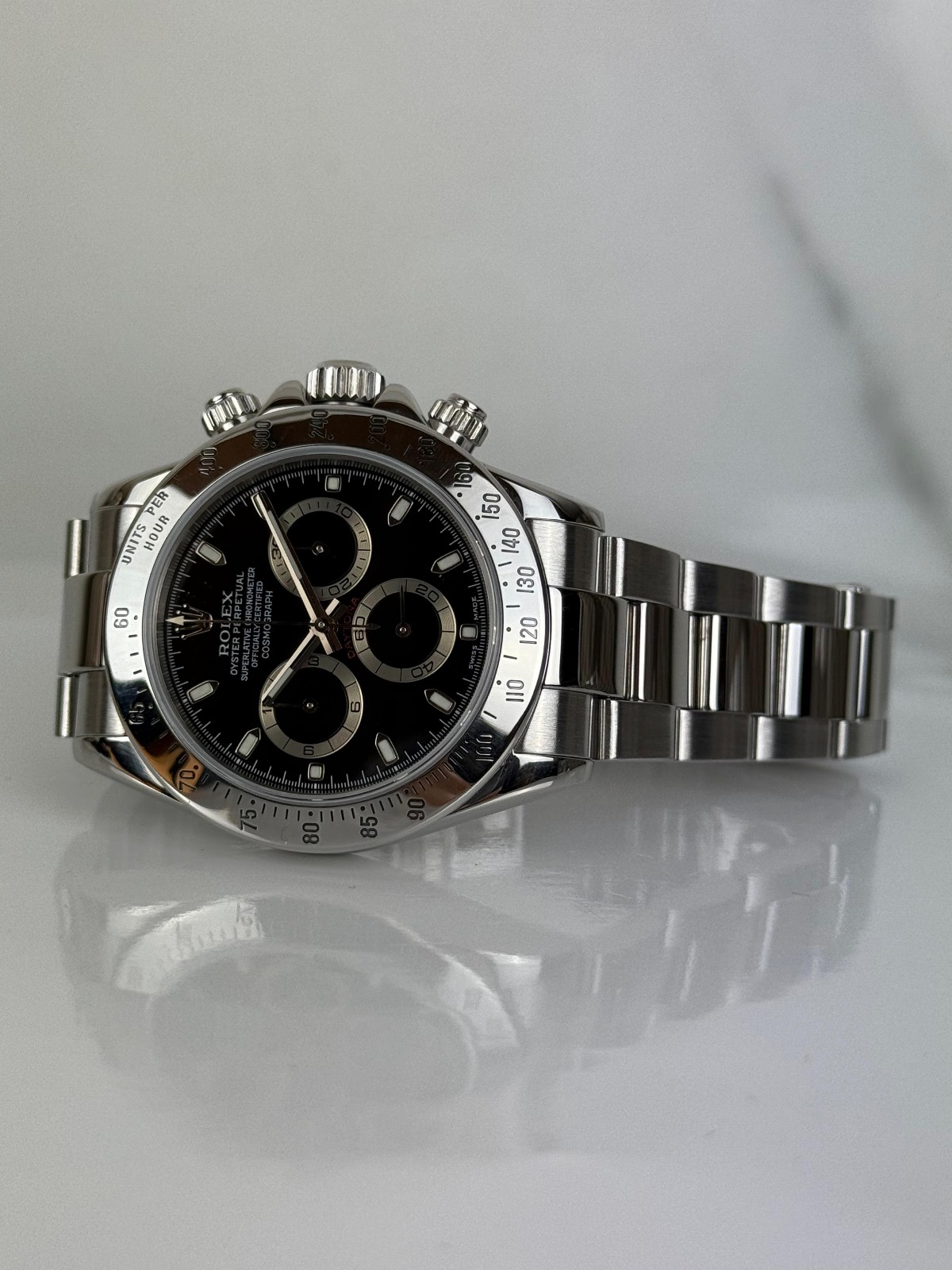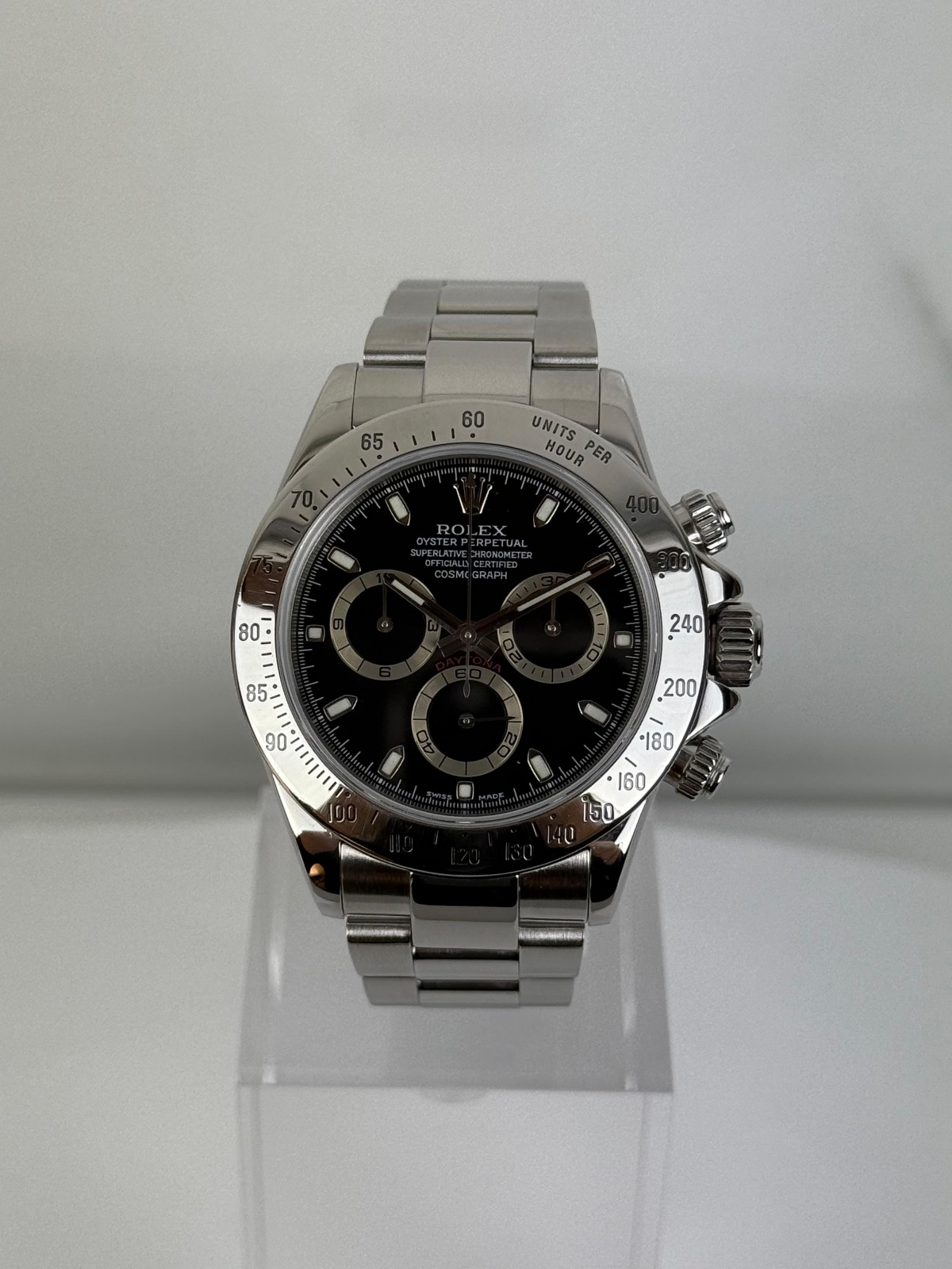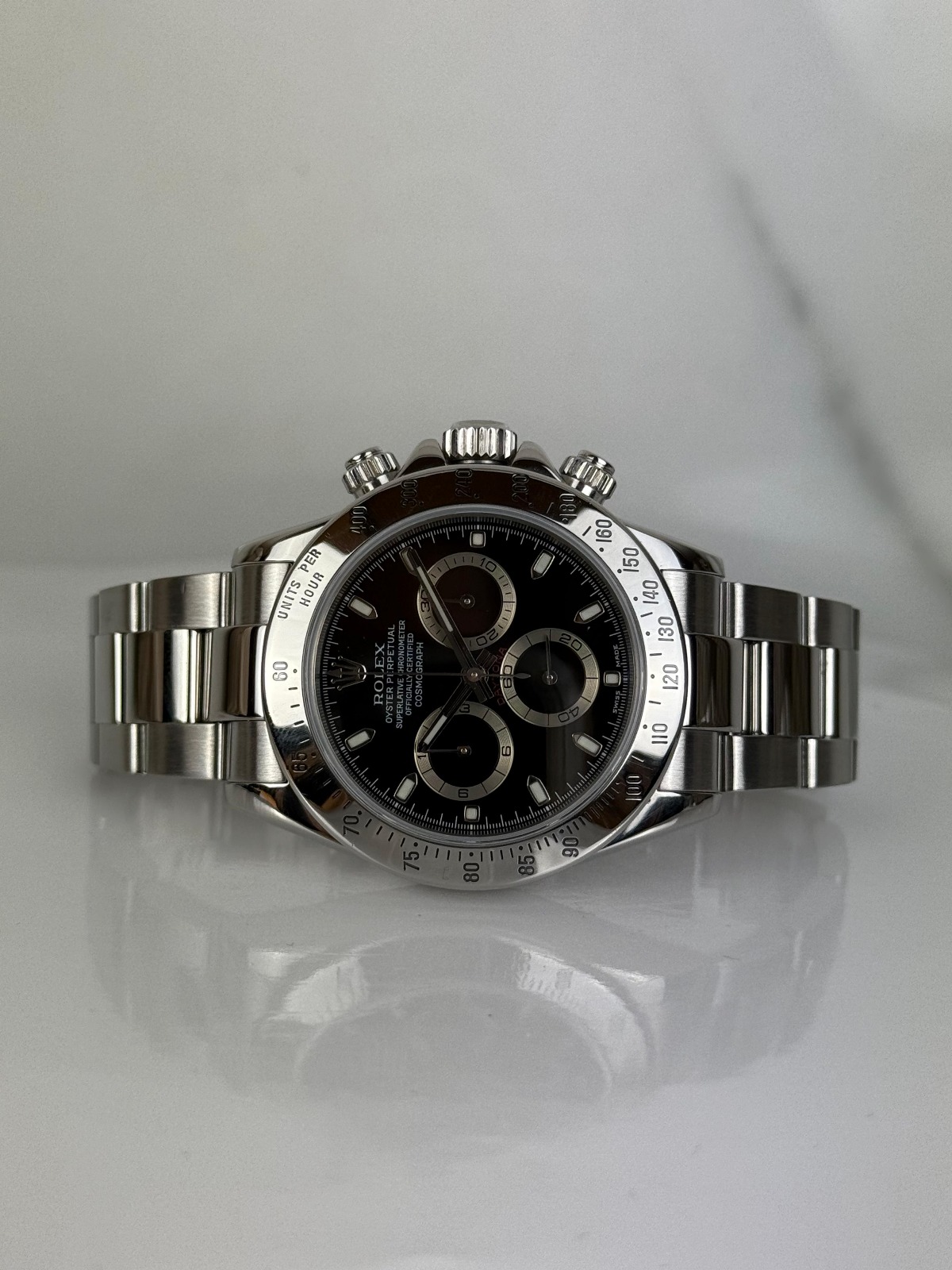 Marca Rolex Modello (Orologio) Daytona Numero di referenza 116520 Carica Automatico Materiale della cassa Acciaio Materiale cinturino Acciaio Anno di produzione 2002 pari al nuovo documenti originali Rolex, box originale Carica Automatico Cassa Materiale della cassa Acciaio Diametro 40 mm Impermeabile 10 ATM Materiale lunetta Acciaio Vetro Vetro zaffiro Quadrante Nero Cinturino Materiale cinturino Acciaio Colore cinturino Acciaio Chiusura Déployante Materiale chiusura Acciaio