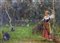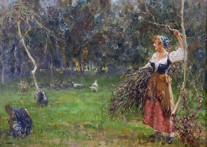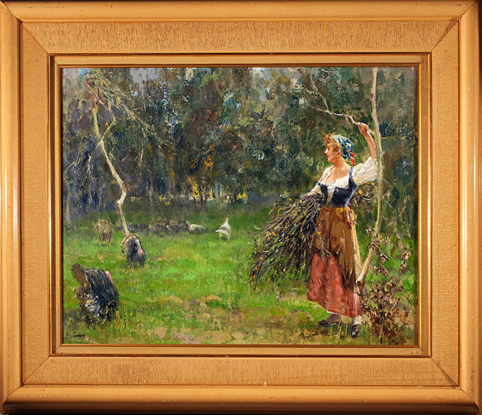 Panza Giovanni (Napoli 1894 - 1989) Contadina con tacchini olio su tela, cm 35x48 firmato in basso a sinistra: G. Panza