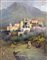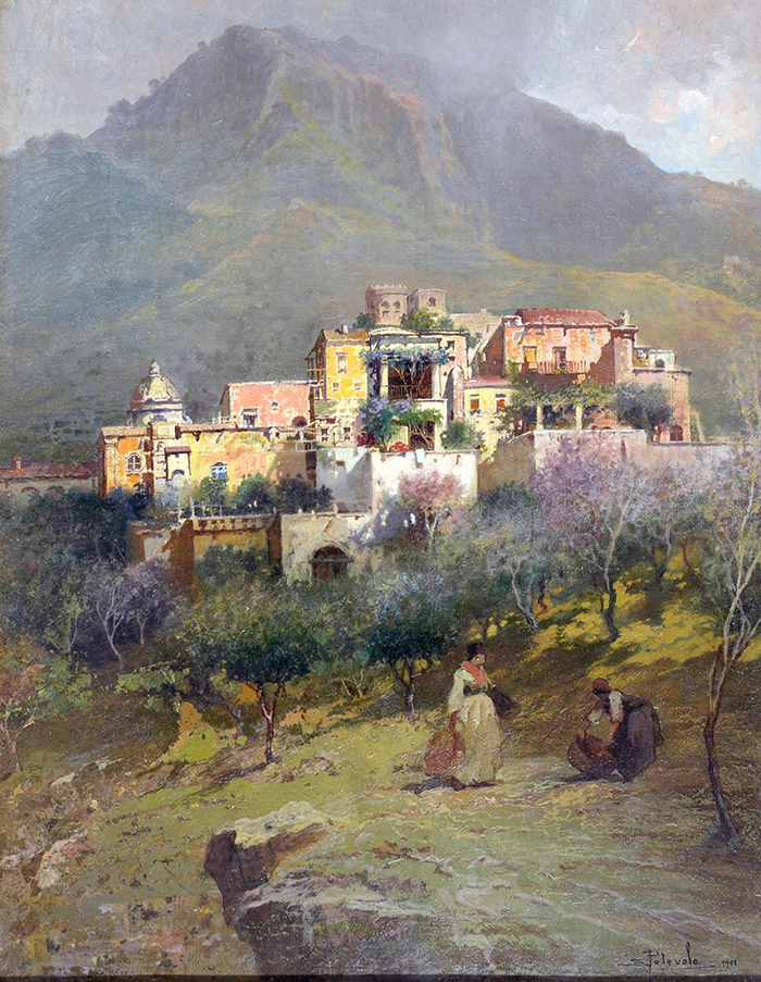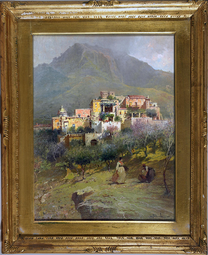 Petruolo Salvatore (Catanzaro 1857 - Napoli 1942) Paese arroccato olio su tela rip. su cartone, cm 45x35 firmato e datato in basso a destra: S. Petruolo 1901