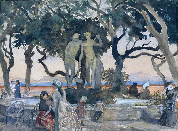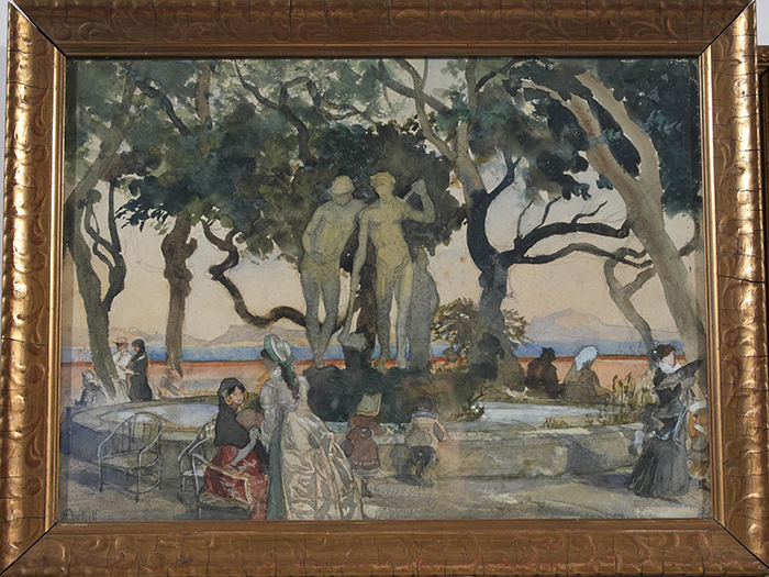 Schill Adolf (1848- 1911) Villa comunale di Napoli tecnica mista su carta, cm 27,5x38 firmato in basso a sinistra: A. Schill iscritto in basso a destra: Napoli