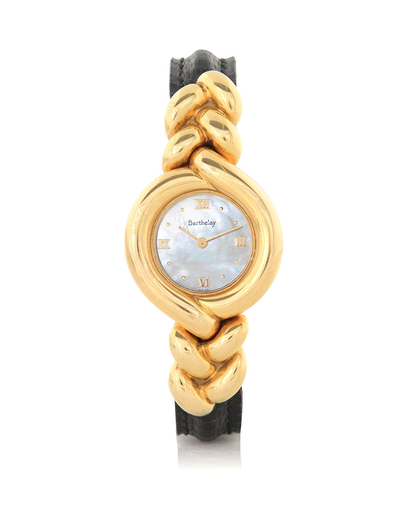 C. 18K yellow gold with braided lugs. D. mother-of-pearl with applied Roman numerals and indexes . M. quartz. Dial, case and movement signed. Accompanied by Barthelay strap and 18K yellow gold buckle.