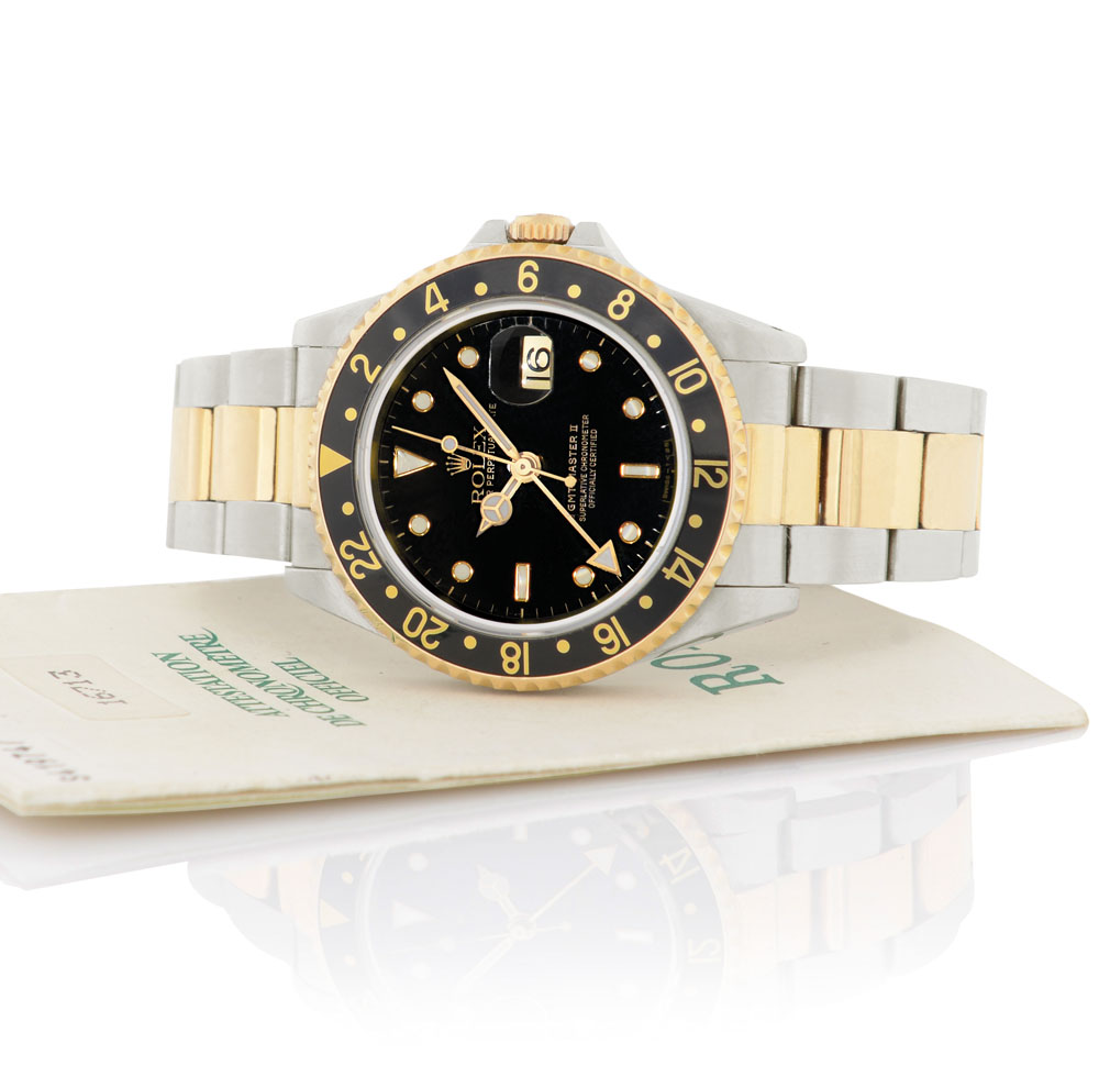 Cassa n. S419747 in acciaio e oro giallo 18 kt con fondello e corona a vite, lunetta nera graduata e girevole, vetro zaffiro. Quadrante nero con indici e lancette luminescenti, secondi e lancetta per fuso orario al centro, data al 3. Movimento a carica automatica. Bracciale Oyster in acciaio e oro giallo 18 kt. Quadrante, cassa, movimento e bracciale firmati.