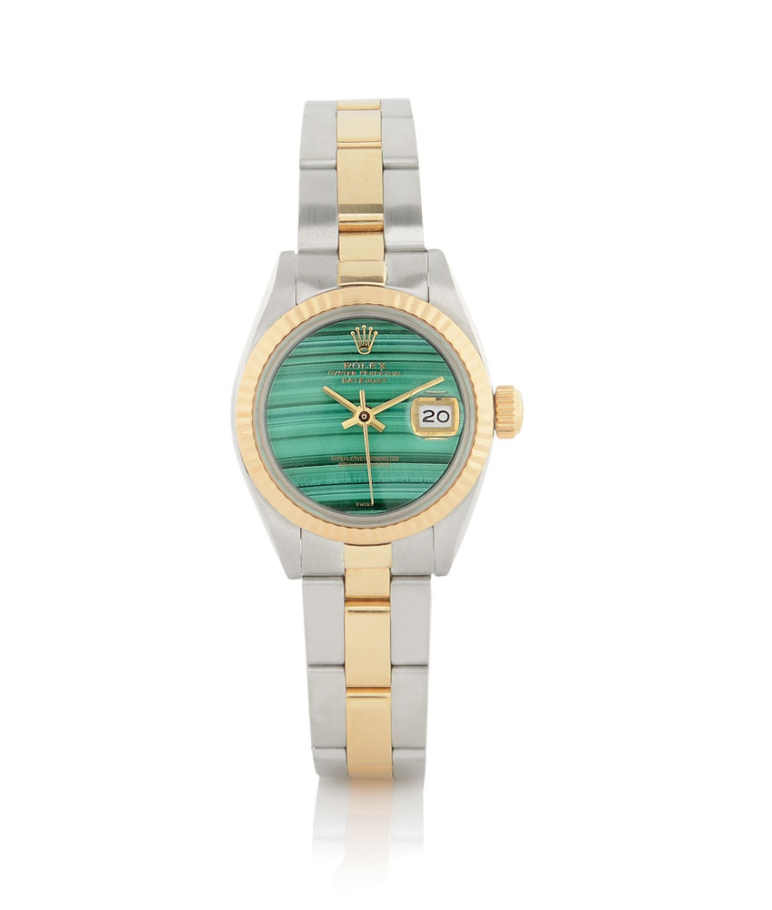 C. stainless steel and 18K yellow gold with screwed case back and crown, reeded bezel. D. malachite with date at 3. M. self-winding. Stainless steel and 18K yellow gold Oyster bracelet. Dial, case, movement and bracelet signed.