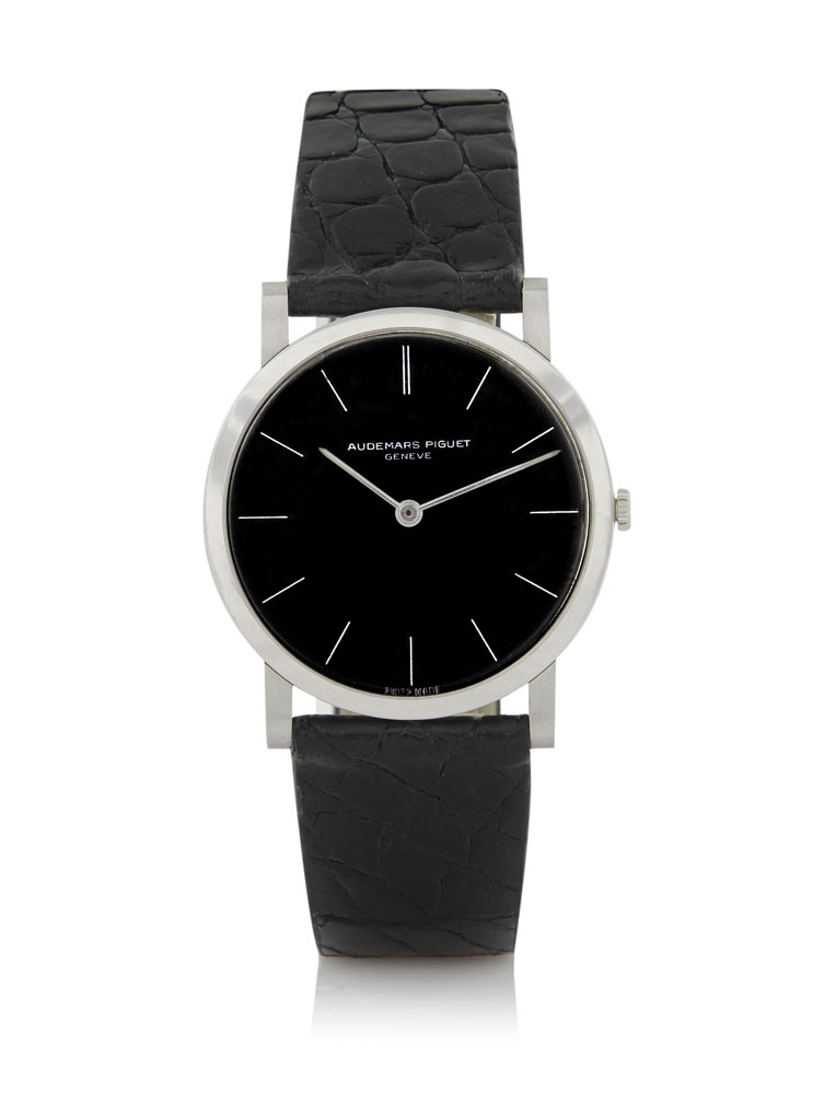 C. slim, platinum. D. black with painted indexes. M. manual winding. Dial, case and movement signed.