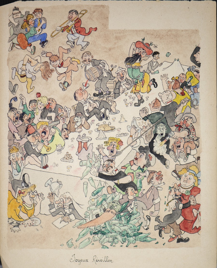 Reveillon Joyeux Illustrazione satirica. acquarello su carta. Cm 26,00 x 32,00. (Collezione Accatino)