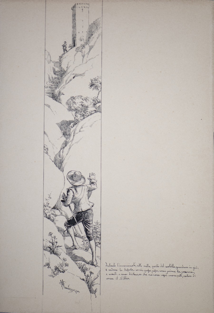 Mantegazza Giacomo (1853 - 1920) Tavola per I promessi sposi. China su carta. Cm 23,00 x 33,00. Illustrazione riquadrata a sinistra e sotto porzione del testo del romanzo. Firma in basso a sinistra.