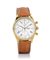 Cassa in oro giallo 18 kt con pulsanti tondi. Quadrante argentato con numeri arabi smaltati, contatore a 12 ore, 24 ore al 12, data al 3, scala tachimetrica periferica. Movimento a carica automatica. Quadrante, cassa e movimento firmati. Completo di astuccio originale.