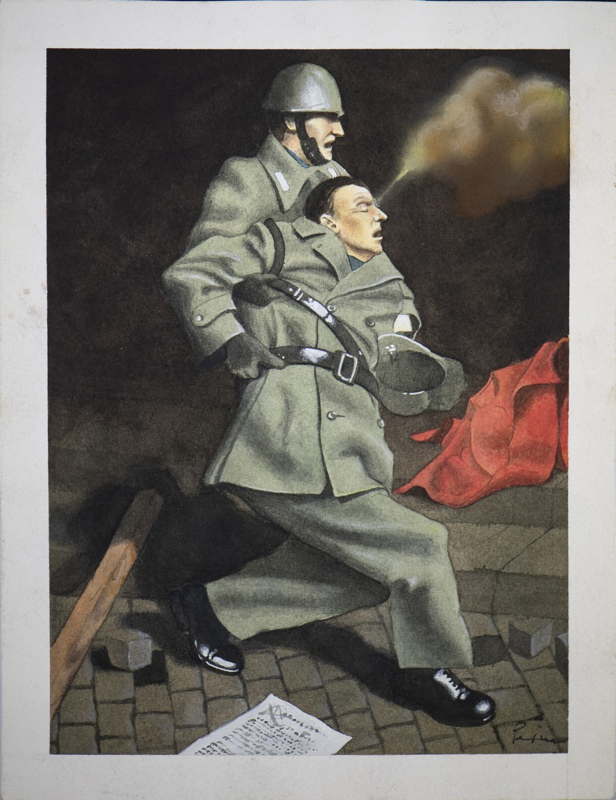 Perini Roberto (1950 - 2019) Soldato ferito dagli anarchici. 1985. Acquarello. Cm 25,00 x 33,00. Firma in basso a destra e timbro sul retro