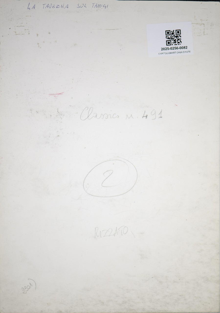 Rizzato Sergio (1936 - 2025) La taverna sul Tamigi. 1985. tecnica mista su cartoncino. Cm 25,50 x 36,00. Originale di copertina realizzato per il libro di Edgard Allan Poe edito dalla Mondadori "La taverna sul Tamigi" pubblicato nella collana I Classici del giallo n 491 dalla Mondadori nel 1985