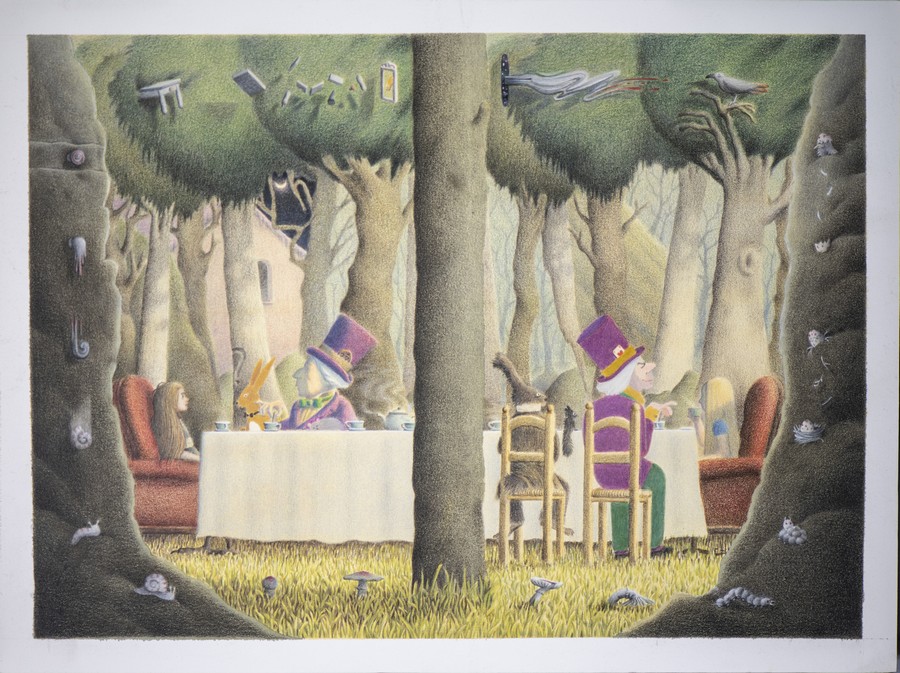 Ufficio Misteri AA VV Un tè per Alice. 216. tecnica mista su cartoncino. Cm 39,00 x 29,00. Tavola pubblicata su La Lettura inserto del Corriere della sera del 13 ottobre 2016 in occasione dello speciale Book City.