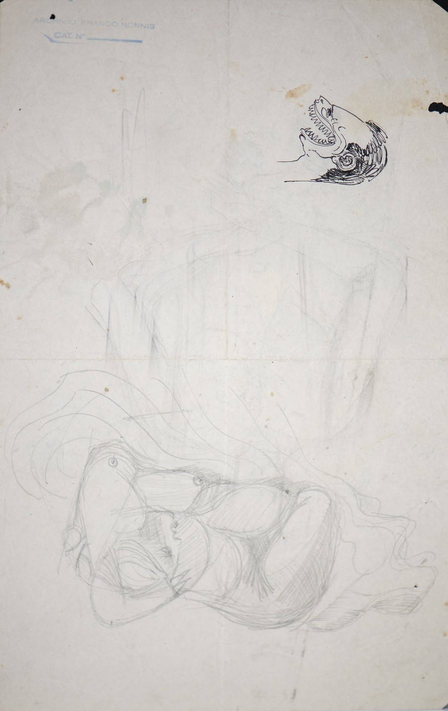 Nonnis Franco (1921 - 1991) Stazione 3 top secret. 1966. tecnica mista. Cm 18,00 x 28,50. Opera che presenta sul retro uno studio di figura e il timbro Archivio Franco Nonnis