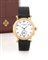 Cassa in oro giallo 18 kt con fondello a cerniera n. 2864036, anse con barra a vite. Quadrante in porcellana bianca con numeri Breguet smaltati, secondi al 6. Movimento calibro 215 n. 769124 a carica manuale. Quadrante, cassa e movimento firmati. Completo di cinturino e fibbia in oro originali, astuccio ed estratto di registro.