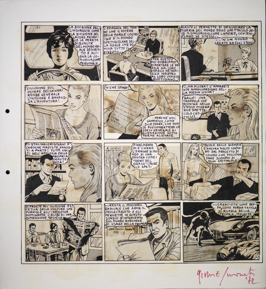 Simonetti Gianni Emilio (n. 1940) Tavola a collage ed interventi su Diabolik. Collage e tecnica mista. Cm 35,00 x 38,00. Firmato a china in basso al centro 1972.