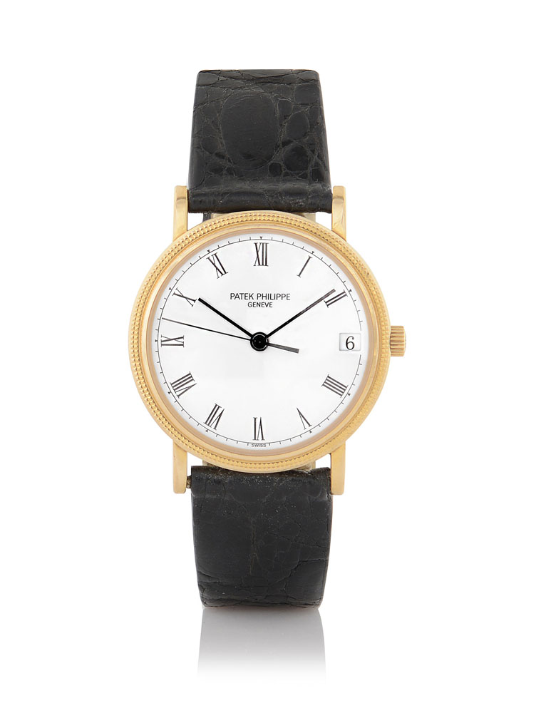 PATEK PHILIPPE GENEVE CALATRAVA REF. 3802/200 DEL 1991. Cassa n. 2895200 in oro giallo 18 kt con lunetta Clous De Paris, oblò sul fondello, vetro zaffiro. Quadrante bianco porcellana con numeri romani smaltati, secondi al centro e data al 3. Movimento n. 1443795 a carica automatica con rotore in oro. Quadrante, cassa e movimento firmati. completo di fibbia in oro giallo 18 kt originale, astuccio e certificato del 02/1992.