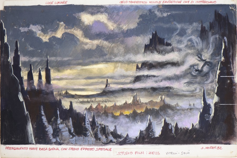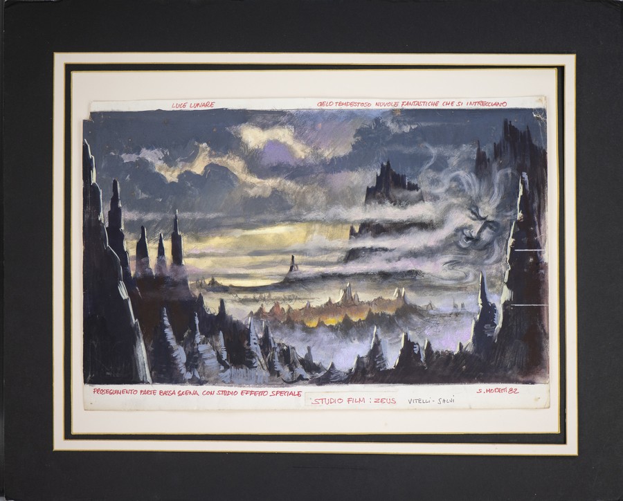 Mocetti S Bozzetto per il film mai realizzato di Emimmo Salvi del 1982. 1982. Tempera su carta. Cm 46,00 x 31,00. Opera su passpartout. Uno studio Film per Zeus.