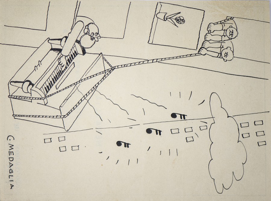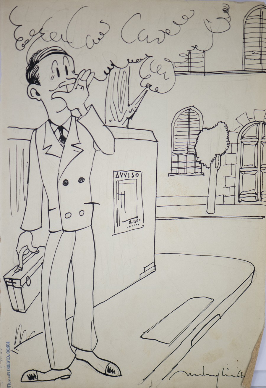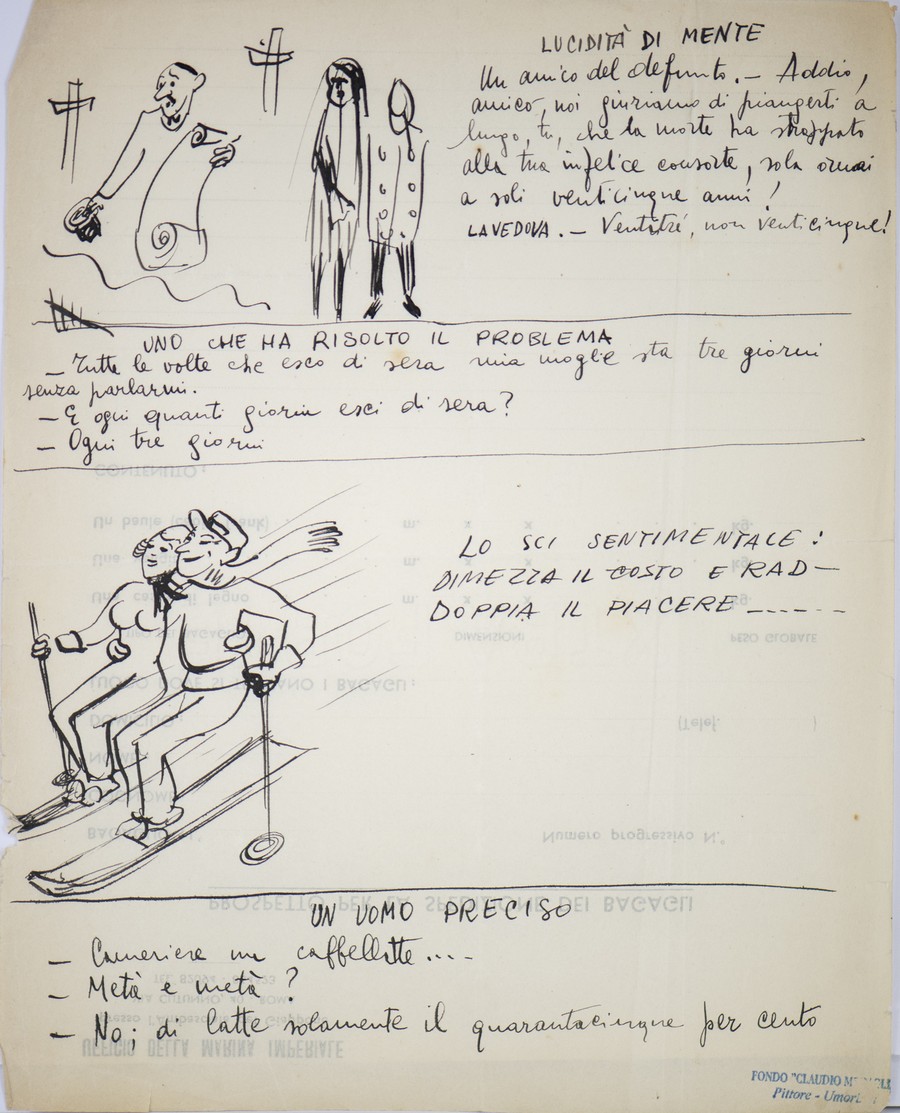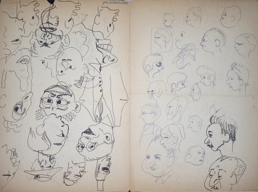 Medaglia Claudio (1919 - 1997) Fogli di appunti per vignette, serie di bozzetti e disegni vari. 1940. China su carta. Cm 23,00 x 29,00. In tutti appare il timbro del Fondo Claudio Medaglia /Pittore e umorista