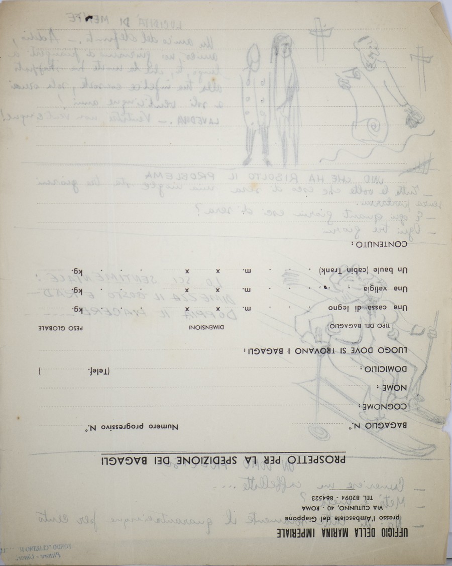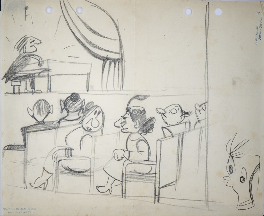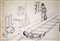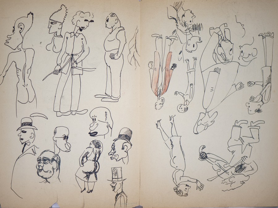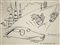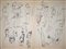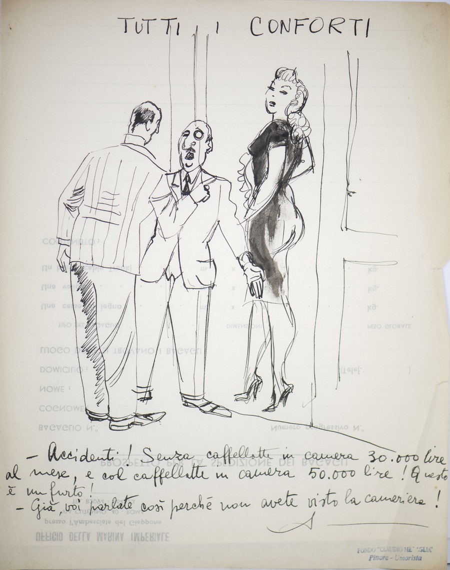 Medaglia Claudio (1919 - 1997) Fogli di appunti per vignette, serie di bozzetti e disegni vari. 1940. China su carta. Cm 23,00 x 29,00. In tutti appare il timbro del Fondo Claudio Medaglia /Pittore e umorista