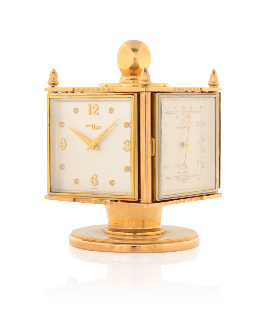Cassa a cubo in ottone dorato girevole su base circolare. Quadrante argentato con indici e numeri arabi applicati, quadranti supplementari argentati con igrometro, barometro e termometro. Movimento a carica manuale (8 giorni).