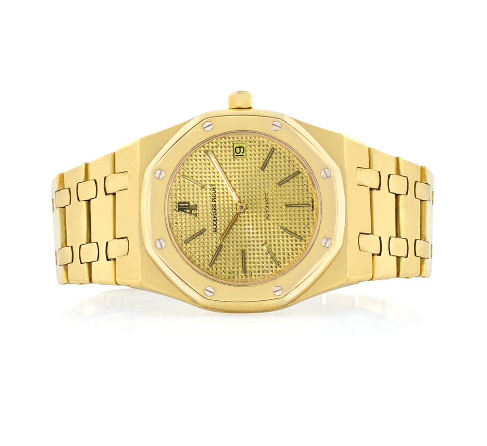 AUDEMARS PIGUET ROYAL OAK JUMBO N. 485 ANNI '80. Cassa piatta in oro giallo 18 kt con fondello e lunetta ottagonali chiusi da viti, vetro zaffiro. Quadrante dorato guilloché con indici applicati e data al 3. Movimento a carica automatica. Bracciale in oro giallo 18 kt. Quadrante, cassa, movimento e bracciale firmati.