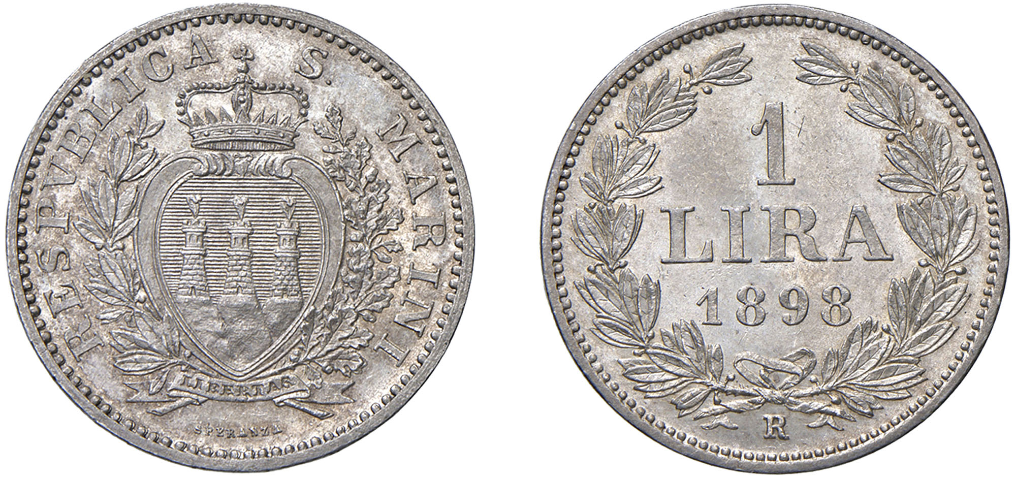 SAN MARINO - Vecchia monetazione (1864-1938) - 1 lira 1898, Roma.Argento - 5,00 gr.Dritto: Stemma coronato tra un ramo di lauro ed uno di quercia. - Rovescio: Iscrizione tra due rami di lauro, legati in basso con fiocco.Gigante 27 RaraDi notevole freschezza d'aspetto.FDC