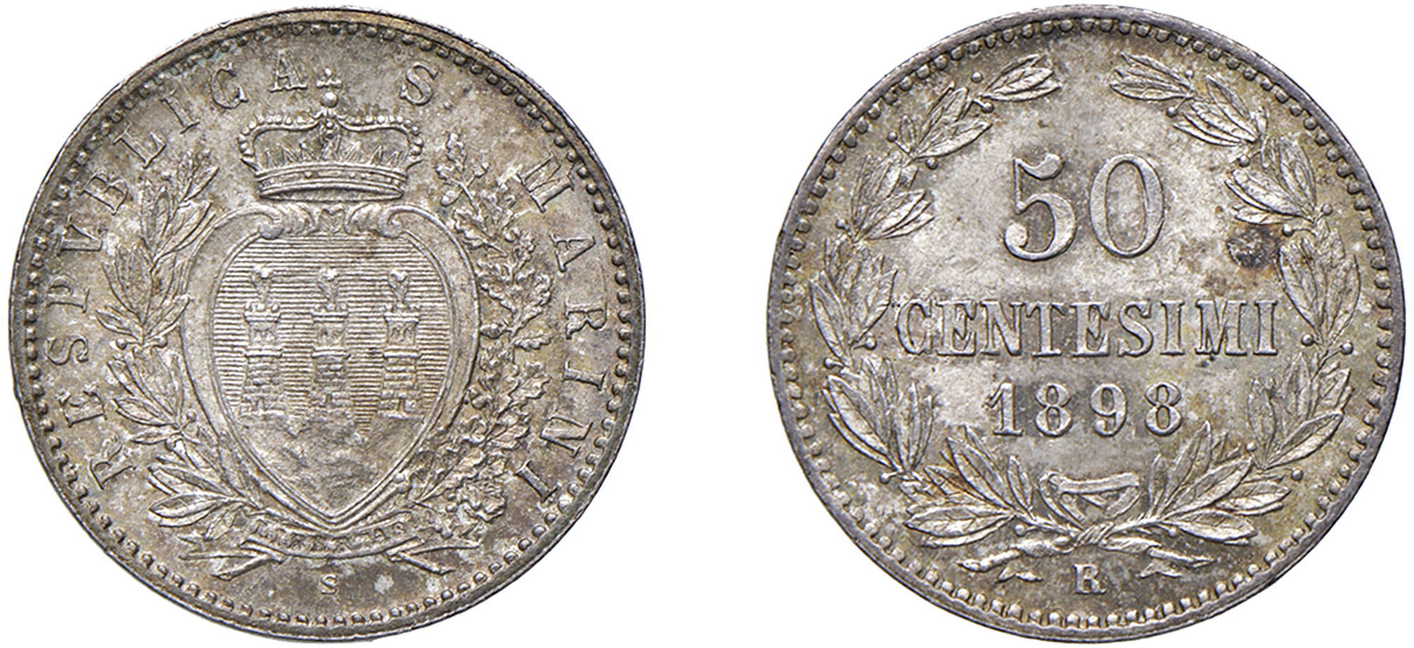 SAN MARINO - Vecchia monetazione (1864-1938) - 50 centesimi 1898, Roma.Argento - 2,49 gr.Dritto: Stemma coronato tra un ramo di lauro ed uno di quercia. - Rovescio: Iscrizione tra due rami di lauro, legati in basso con fiocco.Gigante 29Bella patina di vecchia raccolta.FDC