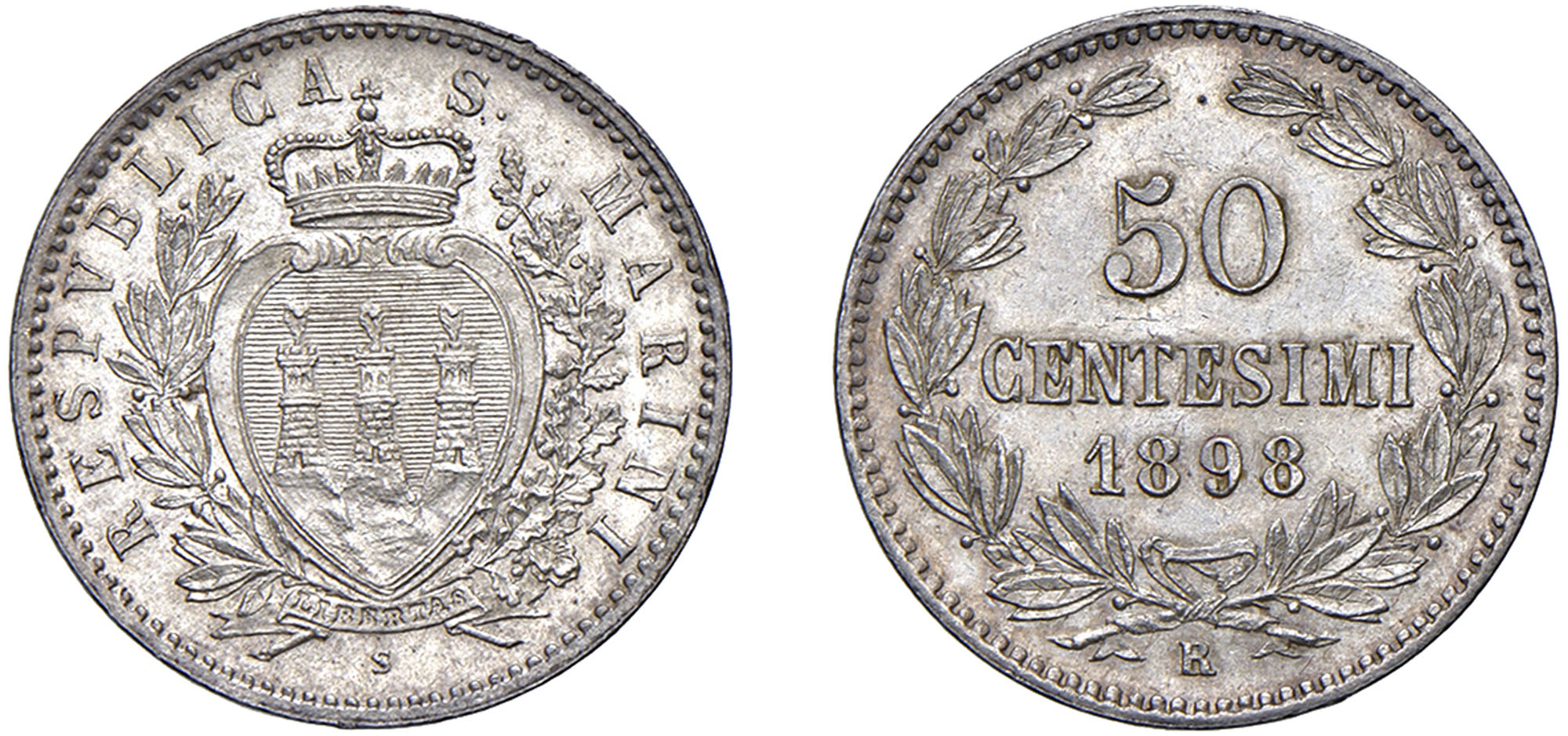 SAN MARINO - Vecchia monetazione (1864-1938) - 50 centesimi 1898, Roma.Argento - 2,49 gr.Dritto: Stemma coronato tra un ramo di lauro ed uno di quercia; - Rovescio: Iscrizione tra due rami di lauro, legati in basso con fiocco.Gigante 29q.FDC