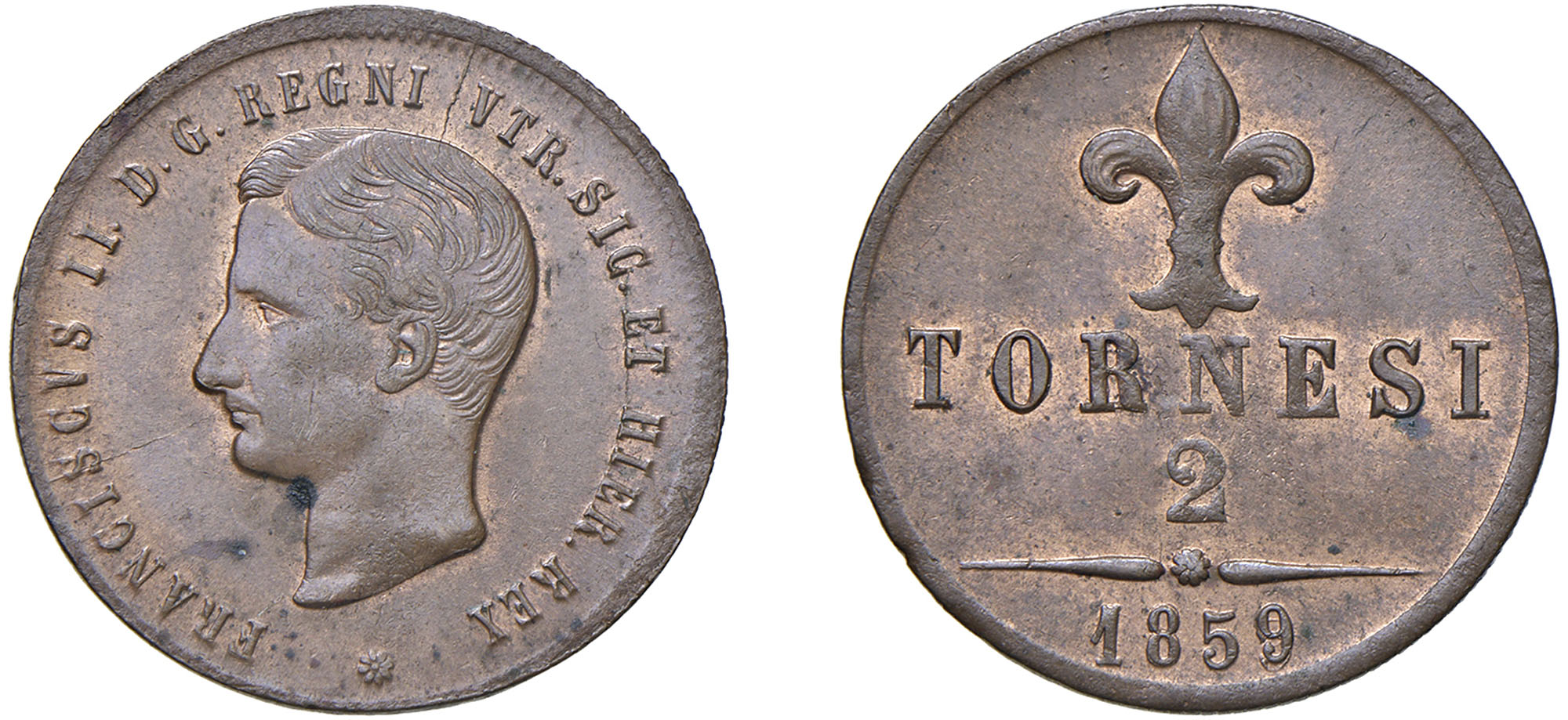 NAPOLI - FRANCESCO II (1859-1860) - 2 tornesi 1859 in lotto con 5 tornesi.RameGigante 6Lieve punto di ossidazione sull'esemplare da 2 tornesi altrimenti q.FDC rosso.In lotto con 5 tornesi 1843 (B).