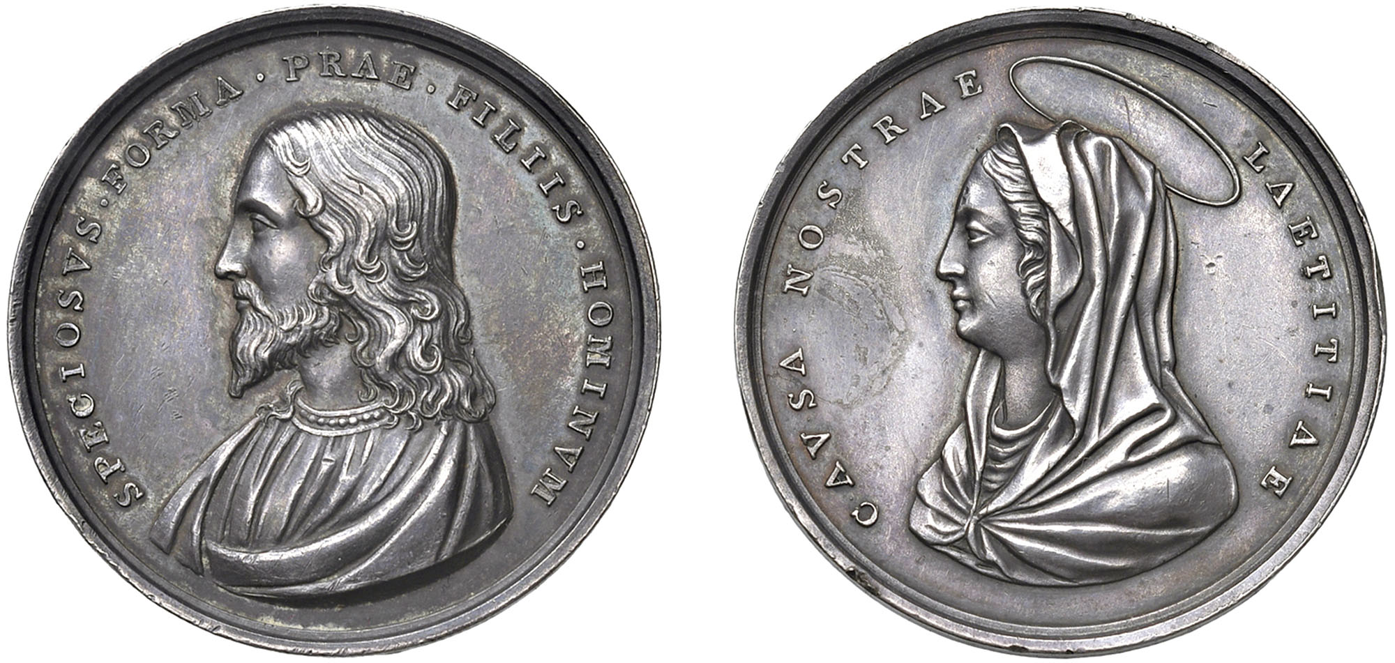 MEDAGLIE VOTIVE - Medaglia votiva, XIX secolo.Argento, 19,51 gr. - Diam. 34,00 mmDritto: Busto di Gesù a sinistra; - Rovescio: Busto a sinistra della Madonna.Opus Giovanni Hamerani.Colpetti al bordo e graffietti di pulizia al Rovescio.q.SPLIl conio al /R è stato realizzato da Giovanni Hamerani nel 1804, in occasione del viaggio a Parigi di Papa Pio VII.