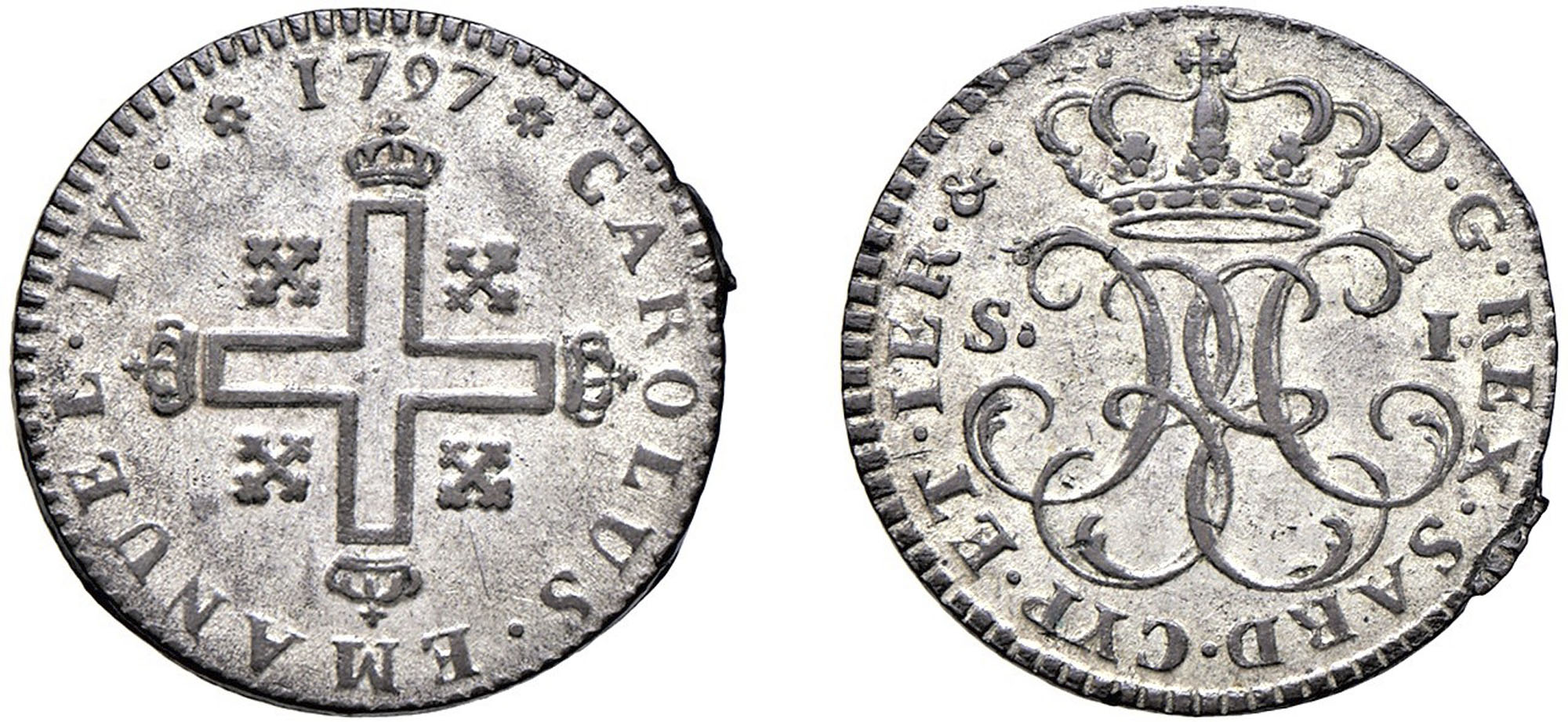 CARLO EMANUELE IV (1796-1800) - Soldo, 1797Mistura - 2,06 gr.Dritto: Croce piana con le estremità coronate e quattro croci mauriziane nei cantoni. - Rovescio: Monogramma coronato composto da un doppio CE.Gigante 17 RaroLieve difetto di conio al ciglio. Buona argentatura.SPL-FDC