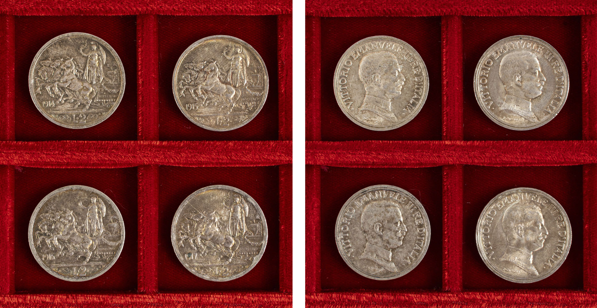 VITTORIO EMANUELE III (1900-1943) - Serie delle 2 lire quadriga briosa (1914-1917).Argento - 39,99 gr.Dritto: Semibusto a destra in uniforme, con il Collare dell'Annunziata; - Rovescio: L'Italia, con ramo d'ulivo e scudo, in piedi su quadriga briosa a sinistra, ornata da fiori e FERT.Nomisma 1163, 1164, 1165, 1166 (Non comune)Ottimi esemplari con delicate patine omogenee di vecchia raccolta.Conservazioni mediamente q.FDC.