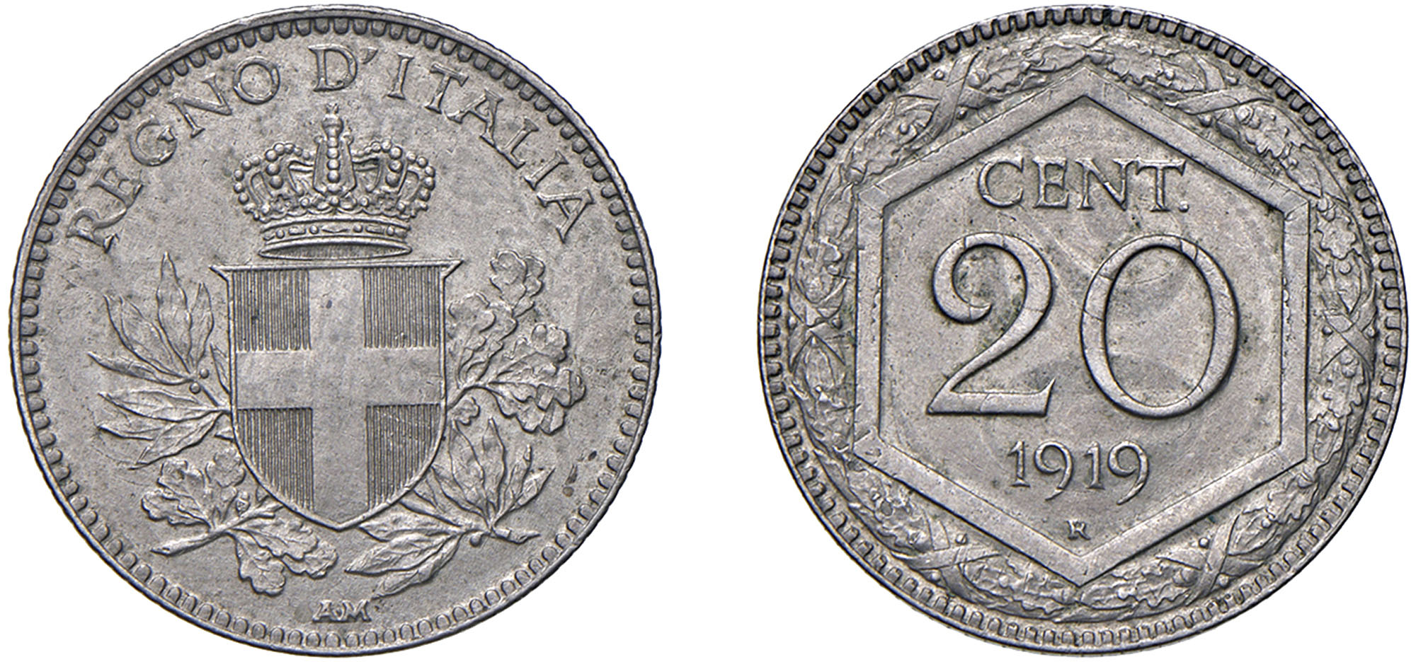 VITTORIO EMANUELE III (1900-1943) - 20 centesimi 1919, esagono.Nickel - 3,87 gr.Dritto: Stemma sabaudo, crociato e coronato, tra un ramo di lauro ed uno di quercia intrecciati; - Rovescio: Esagono contenente valore, tutto entro corona di lauro.Gigante 215Buone tracce di ribattitura.FDC'Su molti pezzi di questa moneta è possibile rilevare le tracce del conio precedente ed infatti alcuni esemplari risultano avere il contorno rigato o tracce di esso. La rigatura si può manifestare in maniera più o meno evidente fino ad essere quasi impercettibile. Gli esemplari che presentano il contorno rigato in modo continuo ed evidente sono più rari...' (Cit. Fabio Gigante, Catalogo nazionale delle monete italiane, pag. 161)