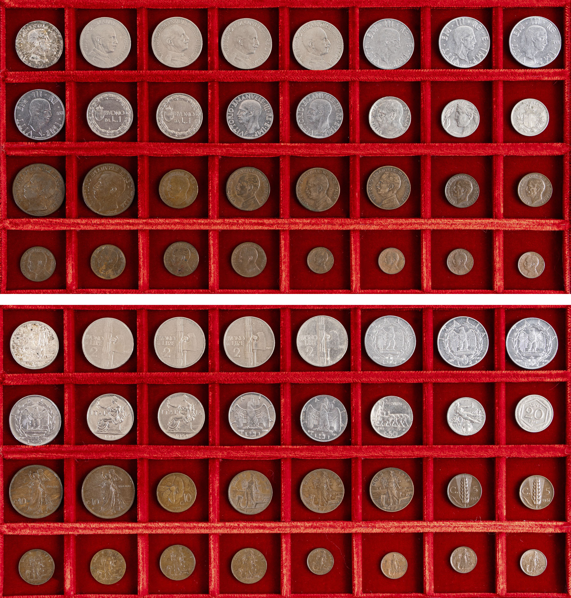 VITTORIO EMANUELE III (1900-1943) - Lotto di 32 monete.Vari metalli, di cui argento 10,00 gr.Nomisma 1163, 1167, 1168, 1169, 1170 (Raro), 1184 (Non comune), 1185, 1188, 1190 (Non comune), 1206, 1208, 1227, 1230 (Non comune), 1233 (Non comune), 1278, 1291, 1309 (due esemplari), 1310 (Raro), 1340 (Raro), 1341 (Non comune), 1342 (Non comune), 1364, 1367 (Raro), 1384 (Raro), 1386 (Non comune), 1388, 1390, 1397, 1401 (Non comune), 1402, 1404.Varie conservazioni da q.MB a q.FDCDa esaminare.