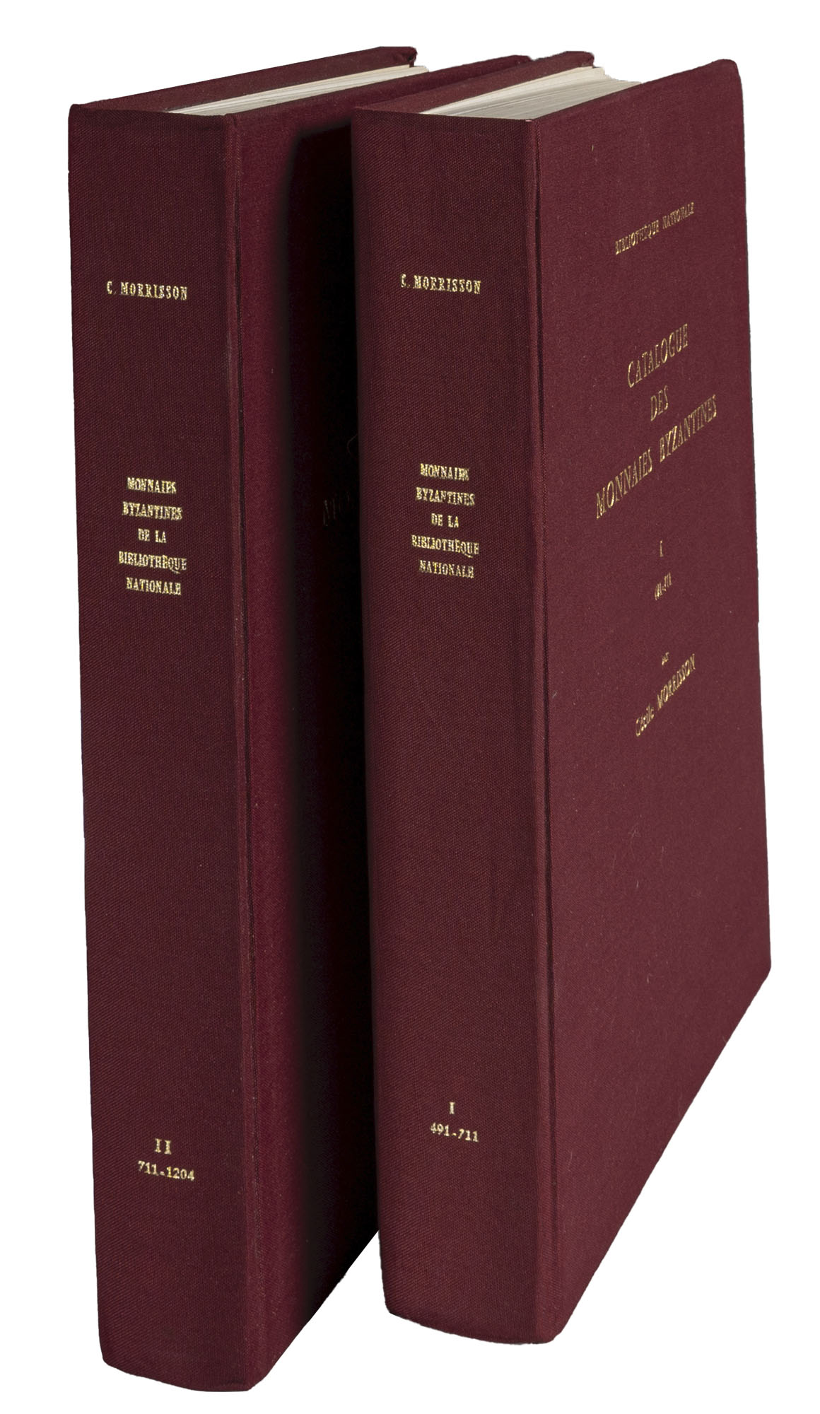 MORRISON CECILE - Catalogue des monnaies Byzantines (2 tomi).Volume 1: Da Anastasio I a Giustiniano II (491-711). Parigi, 1970. pp. 435, tavv. 64. - Volume 2: Da Filippico ad Alessio III (711-1204). Parigi, 1970, pp. 437-844, tavv. 65-103.Catalogo delle monete bizantine della Biblioteca Nazionale di Parigi.Solida legatura in tutta tela editoriale con titoli dorati al dorso e sul piatto anteriore.In ottimo stato generale.