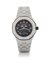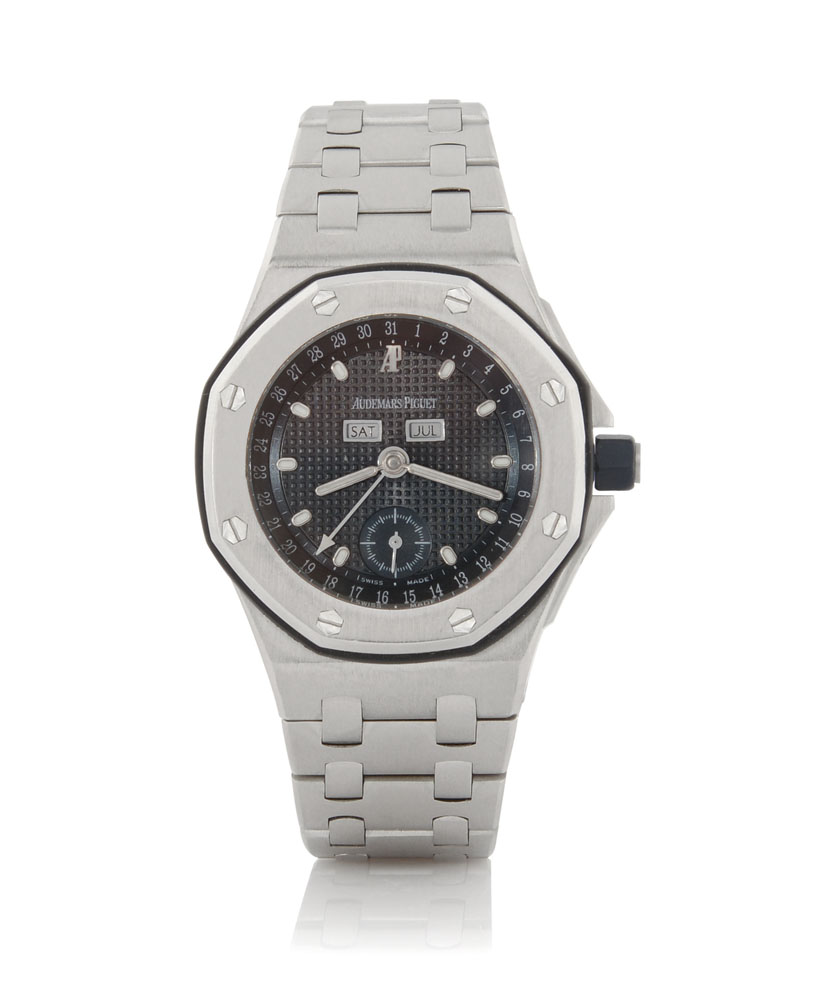 C. solid, stainless steel with octagonal-shaped case back and bezel secured by screws, sapphire crystal. D. black Grande Tapisserie with luminous indexes and hands, subsidiary seconds, apertures for day and date, English, at 12, outermost date with corresponding central hand. M. self-winding. Stainless steel bracelet. Dial, case, movement and bracelet signed.