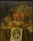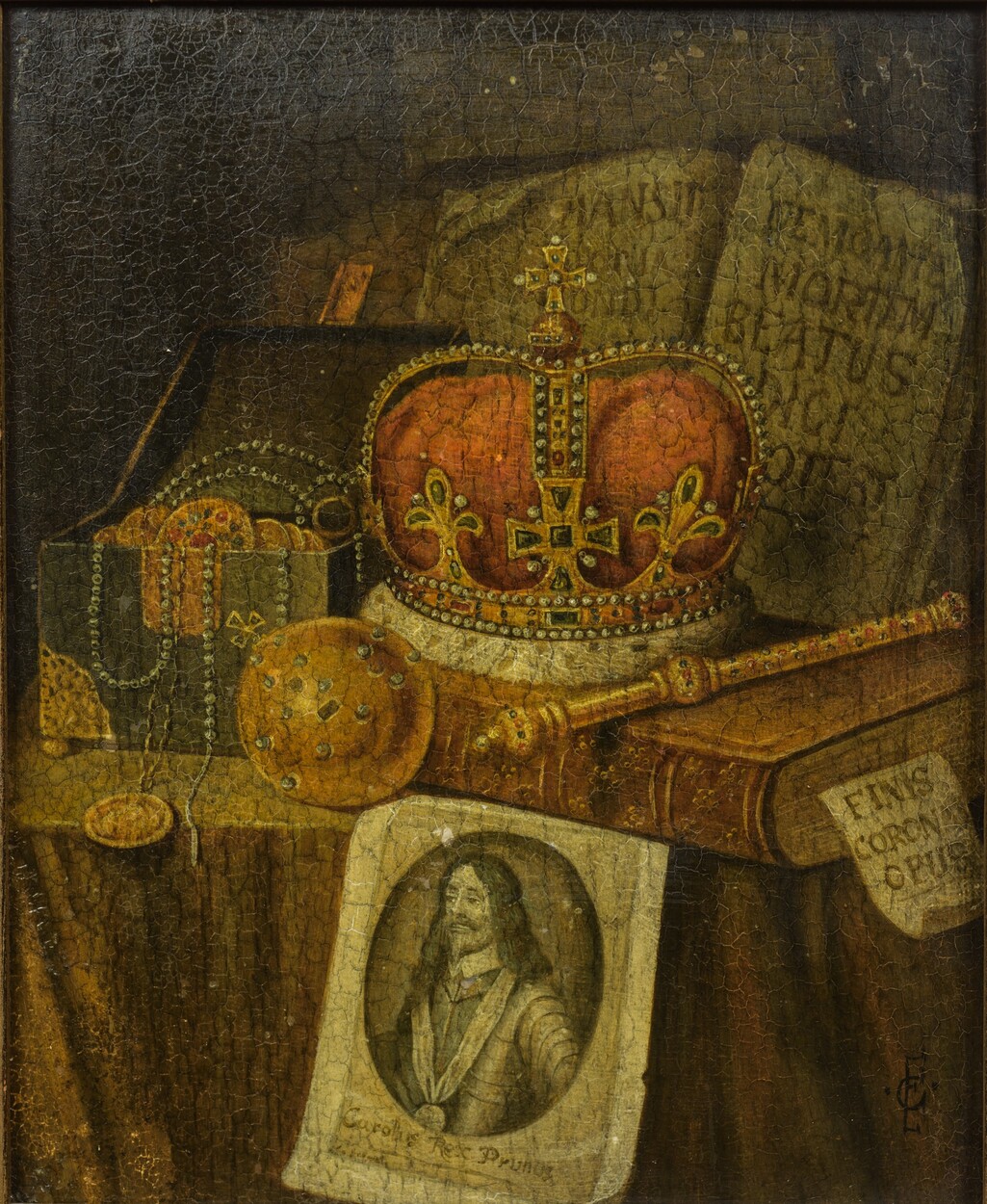 Natura morta con forziere, scettro, corona e ritratto di Carlo I XIX secolo olio su tavola 39 x 34 cm