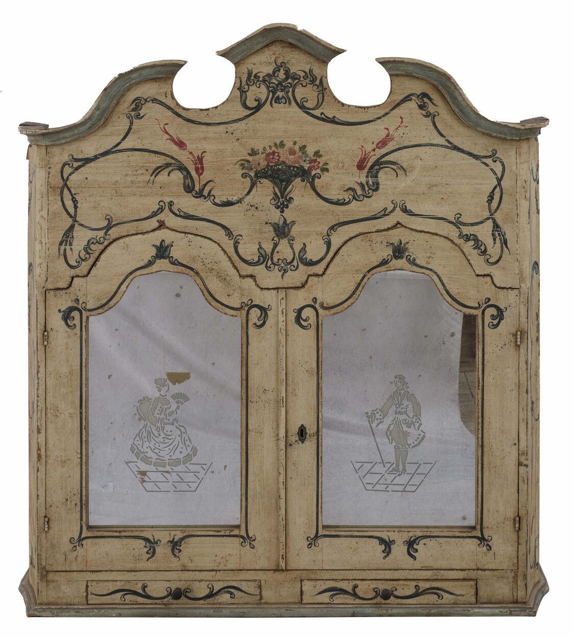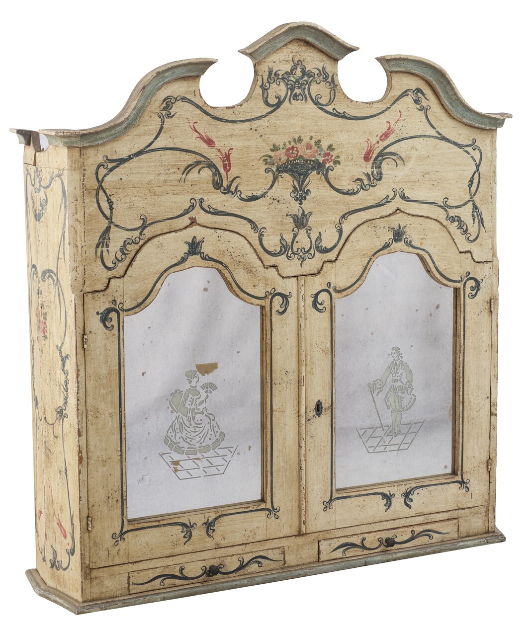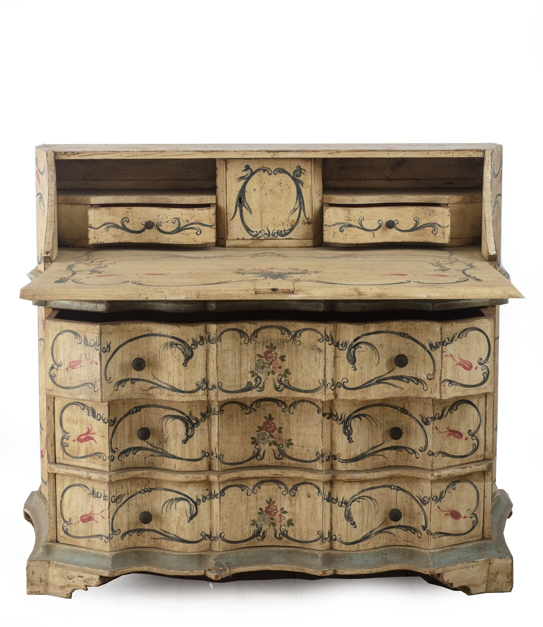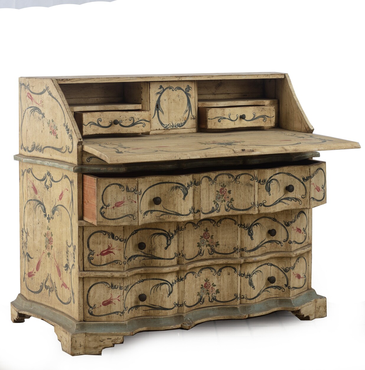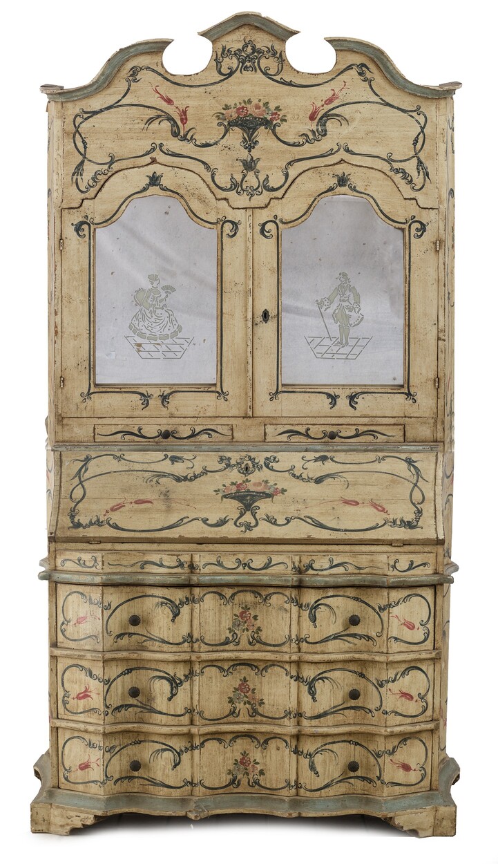 In legno laccato e decorato a motivo floreali, con doppia anta superiore specchiata e parte inferiore a ribalta con scompartimenti interni e 3 cassetti.